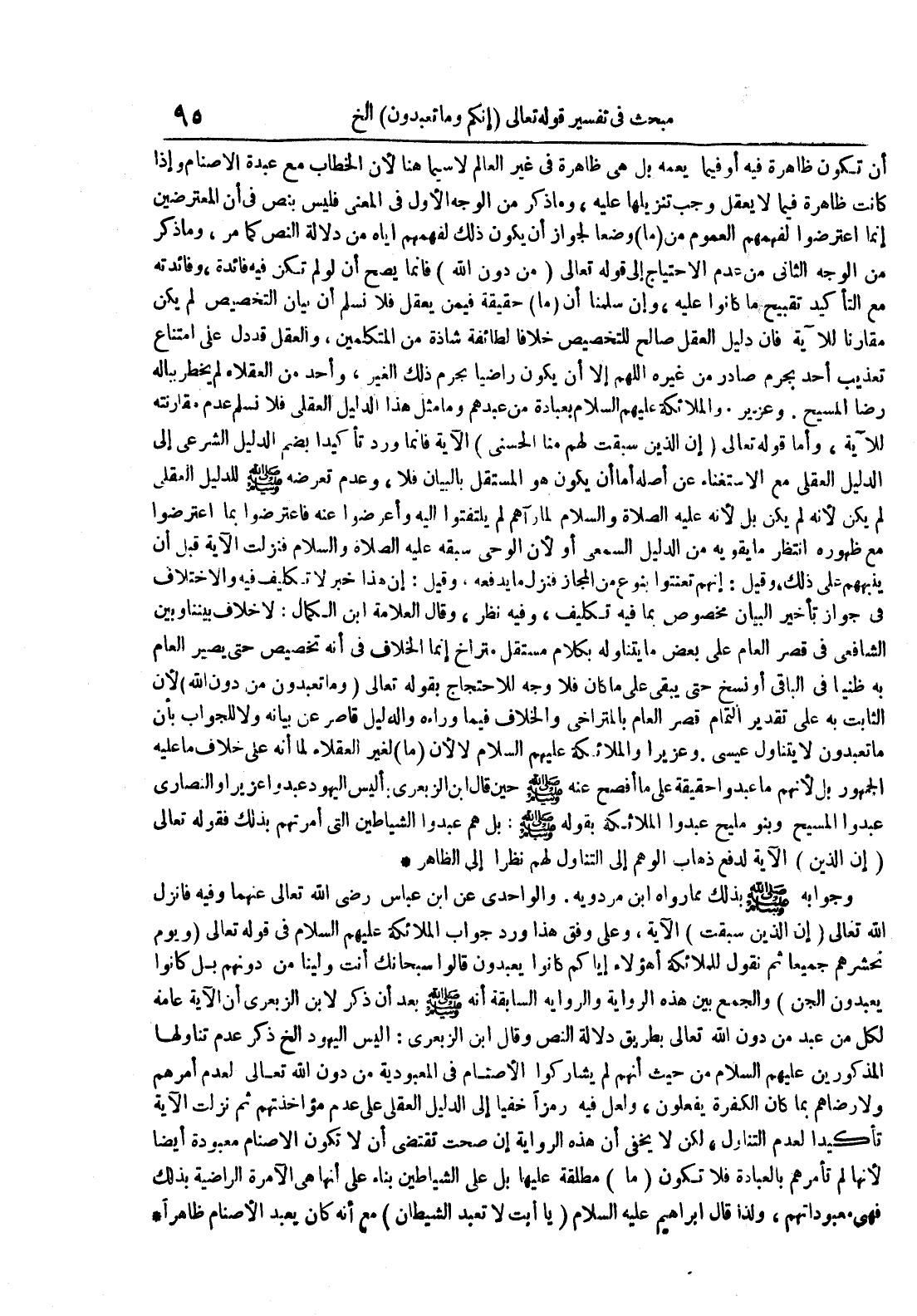 أن تكون ظاهرة فيه أو فيما يعمه بل هي ظاهرة في غير العالم لا سيما هنا لأن الخطاب مع عبدة الأصنام وإذا كانت ظاهرة فيما لا يعقل وجب تنزيلها عليه وما ذكر من الوجه الأول في المعنى فليس بنص في أن المعترضين إنما اعترضوا لفهمهم العموم من ما وضعا لجواز أن يكون ذلك لفهمهم إياه من دلالة النص كما مر وما ذكر من الوجه الثاني من عدم الإحتياج إلى قوله تعالى من دون الله فإنما يصح أن لو لم تكن فيه فائدة وفائدته مع التأكيد تقبيح ما كانوا عليه وإن سلمنا أن ما حقيقة فيمن يعقل فلا نسلم أن بيان التخصيص لم يكن مقارنا للآية فإن دليل العقل صالح للتخصيص خلافا لطائفة شاذة من المتكلمين والعقل قد دل على امتناع تعذيب أحد بجرم صادر من غيره اللهم إلا أن يكون راضيا بجرم ذلك الغير وأحد من العقلاء لم يخطر بباله رضا المسيح وعزير والملائكة عليهم السلام بعبادة من عبدهم وما مثل هذا الدليل العقلي فلا نسلم عدم مقارنته للآية وأما قوله تعالى إن الذين سبقت لهم منا الحسنى الآية فإنما ورد تأكيد بضم الدليل الشرعي إلى الدليل العقلي مع الإستغناء عن أصله أما أن يكون هو المستقل بالبيان فلا وعدم تعرضه صلى الله عليه و سلم للدليل العقلي لم يكن لأنه لم يكن بل لأنه عليه الصلاة و السلام لما رآهم لم يلتفتوا إليه وأعرضوا عنه فاعترضوا بما اعترضوا مع ظهوره انتظر ما يقويه من الدليل السمعي أو لأن الوحي سبقه عليه الصلاة و السلام فنزلت الآية قبل أن ينبههم على ذلك وقيل : إنهم تعنتوا بنوع من المجاز فنزل ما يدفعه وقيل : إن هذا خبر لا تكليف فيه والإختلاف في جواز تأخير البيان مخصوص بما فيه تكليف وفيه نظر وقال العلامة ابن الكمال : لا خلاف بيننا وبين الشافعي في قصر العام على بعض ما يتناوله بكلام مستقل متراخ إنما الخلاف في أنه تخصيص حتى يصير العام به ظنيا في الباقي أو نسخ حتى يبقى على ما كان فلا وجه للإحتجاج بقوله تعالى وما تعبدون من دون الله لأن الثابت به على تقدير التمام قصر العام بالمتراخي والخلاف فيما وراءه والدليل قاصر على بيانه ولا للجواب بأن ما تعبدون لا يتناول عيسى وعزيزا والملائكة عليهم السلام لا لأن ما لغير العقلاء لما أنه على خلاف ما عليه الجمهور بل لأنهم ما عبدوا حقيقة على ما أفصح عنه صلى الله عليه و سلم حين قال ابن الزبعري : أليس اليهود عبدوا عزيرا والنصارى عبدوا المسيح وبنوا مليح عبدوا الملائكة بقوله صلى الله عليه و سلم : بل هم عبدوا الشياطين التي أمرتهم بذلك فقوله تعالى إن الذين الآية لدفع ذهاب الوهم إلى التناول ولهم نظرا إلى الظاهر