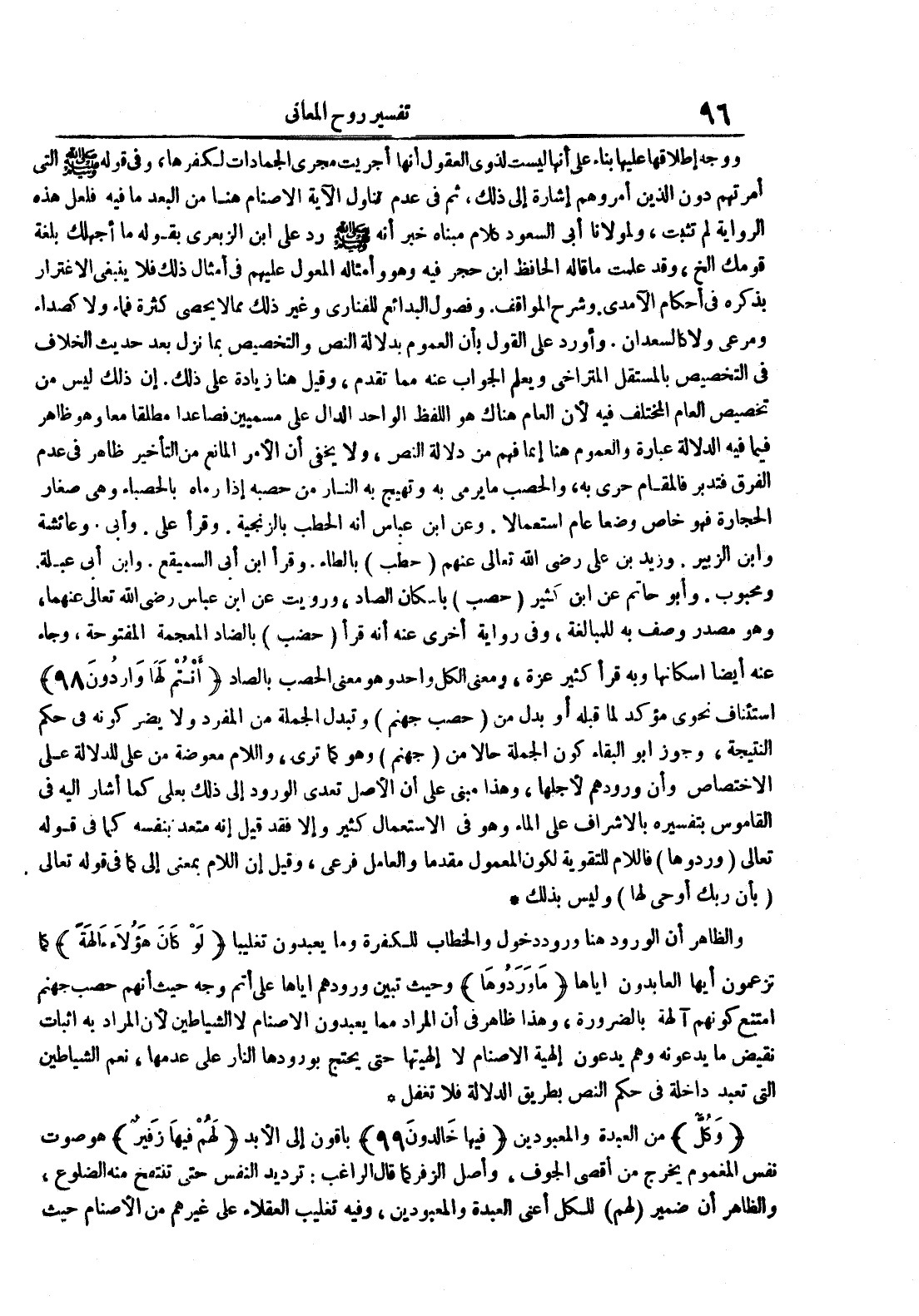 ووجه إطلاقها عليها بناء على أنها ليست لذوي العقول أنها أجريت مجرى الجمادات لكفرها وفي قوله صلى الله عليه و سلم التي أمرتهم دون الذين أمروهم إشارة إلى ذلك ثم في عدم تناول الآية الإصنام هنا من البعد ما فيه فلعل هذه الرواية لم تثبت ولمولانا أبي السعود كلام مبناه خبر أنه صلى الله عليه و سلم رد على ابن الزبعري بقوله ما أجهلك بلغة قومك الخ وقد علمت ما قاله الحافظ ابن حجر فيه وهو أمثاله المعول عليهم في أمثال فلا ينبغي الإغترار بذكره في أحكام الآمدي وشرح المواقف وفصول البدائع للفناوي وغير ذلك مما لا يحصى كثرة فماء ولا كصداء ومرعى ولا كالسعدان وأورد على القول بأن العموم بدلالة النص والتخصيص بما نزل بعد حديث الخلاف في التخصيص بالمستقبل المتراخي ويعلم الجواب عنه مما تقدم وقيل هنا زيادة على ذلك إن ذلك ليس من تخصيص العام المختلف فيه لأن العام هناك هو اللفظ الواحد الدال على مسميين فصاعدا مطلقا معا وهو ظاهر فيما فيه الدلالة عبارة والعموم هنا إنما فهم من دلالة النص ولا يخفى أن الأمر المانع من التأخير ظاهر في عدم الفرق فتدبر فالمقام حري به والحصب ما يرى به وتهيج به النار من حصبه إذا رماه بالحصباء وهي صغار الحجارة فهو وضعا عام استعمالا وعن ابن عباس أنه الحطب بالزنجية وقرأ علي وأبي وعائشة وابن الزبير وزيد بن علي رضي الله تعالى عنهم حطب بالطذاء وقرأ ابن أبي السمقيع وابن أبي عبلى ومحبوب وأبو حاتم عن ابن بشير حصب بإسكان الصاد ورويت عن ابن عباس رضي الله تعالى عنهما وهو مصدر وصف به للمبالغة وفي رواية أخرى عنه قرأ حضب بالضاد المعجمة المفتوحة وجاء عنه أيضا إسكانها وبه قرأ كثير عزة ومعنى الكل واحد وهو معنى الحصب بالصاد أنتم لها واردون