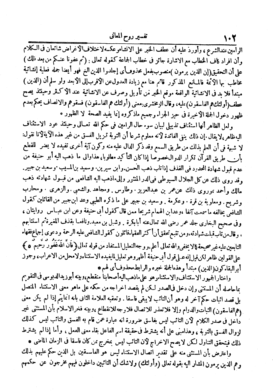ولعل الظاهر أنها استئناف تذييلي لبيان سوء حال الرامين في حكم الله تعالى وحينئذ عود الإستئناف إليه ظاهر لا يقال إن ذلك ينفي الفائدة لأنه معلوم شرعا أن التوبة تنزيل الفسق من غير هذه الآية لأنا نقول : لا شبهة في أن العلم بذلك من طريق السمع وقد ذكر الدال عليه منه وكون آية أخرى تفيده لا يضر للقطع بأن طريق القرآن تكرار الدوال خصوصا إذا كان التأكيد مطلوبا هذا وإلى ما ذهب إليه أبو حنيفة من عدم قبول شهادة المحدود في القذف إذا تاب ذهب الحسن وابن سيرين وسعيد بن المسيب وسعيد بن جبير وقد روي ذلك عن كل الجلال السيوطي في الدر المنثور وإلى ما ذهب إليه الشافعي من قبول شهادته ذهب مالك وأحمد وروي ذلك عن عمر بن عبد العزيز وطاوس ومجاهد والشعبي والزهري ومحارب وشريح ومعاوية بن قرة وعكرمة وسعيد بن جبير على ما ذكره الطيبي وعد ابن جبير من القائلين كقول الشافعي يخالفه ما سمعت آنفا وعد ابن الهمام شريحا ممن قال كقول أبي حنيفة وعن ابن عباس روايتان وفي صحيح البخاري جلد عمر رضي الله تعالى عنه أبا بكرة وشبل بن معبد ونافعا بقذف المغيرة ثم استتابهم وقال من تاب قبلت شهادته ومن تتبع تحقق أن أكثر الفقهاء قائلون كقول الشافعي عليه الرحمة ودعوى إجماع فقهاء التابعين عليه غير صحيحة كما لا يخفى والله تعالى أعلم ووجه التعليل المستفاد من قوله تعالى فإن الله عفور رحيم