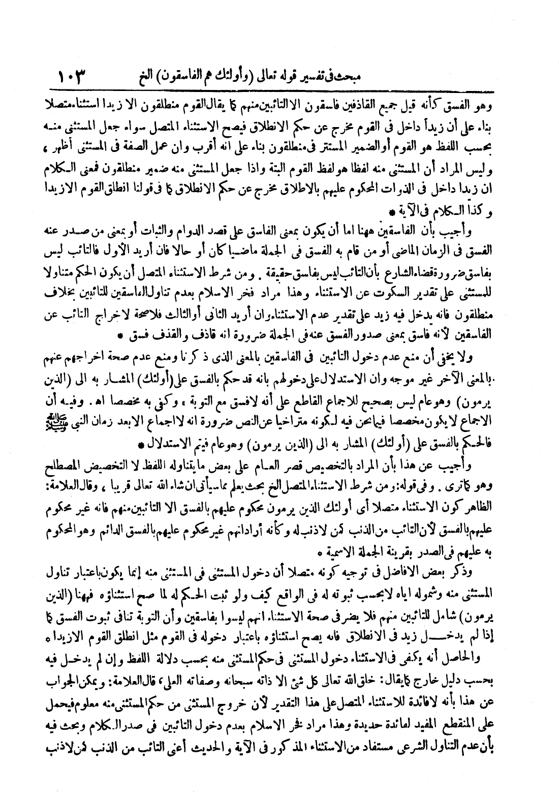 وأجيب بأن الفاسقين ههنا إما أن يكون بمعنى الفاسق على قصد الدوام والثبات أو بمعنى من صدر عنه الفسق في الزمان أو من قام به الفسق في الجملة ماضيا كان أو حالا فإن أريد الأول فالتائب ليس بفاسق ضرورة قضاء الشارع بأن التائب ليس بفاسق حقيقة ومن شرط الإستثناء المتصل أن يكون الحكم متناولا للمستثنى على تقدير السكوت عن الإستثناء وهذا مراد فخر الإسلام بعدم تناول الفاسقين للتائبين بخلاف منطلقون فإنه يدخل فيه زيد على تقدير عدم الإستثناء أريد الثاني أو الثالث فلا صحة لإخراج التائب عن الفاسقين لأنه فاسق بمعنى صدور الفسق عنه في الجملة ضرورة أنه قاذف والقذف فسق