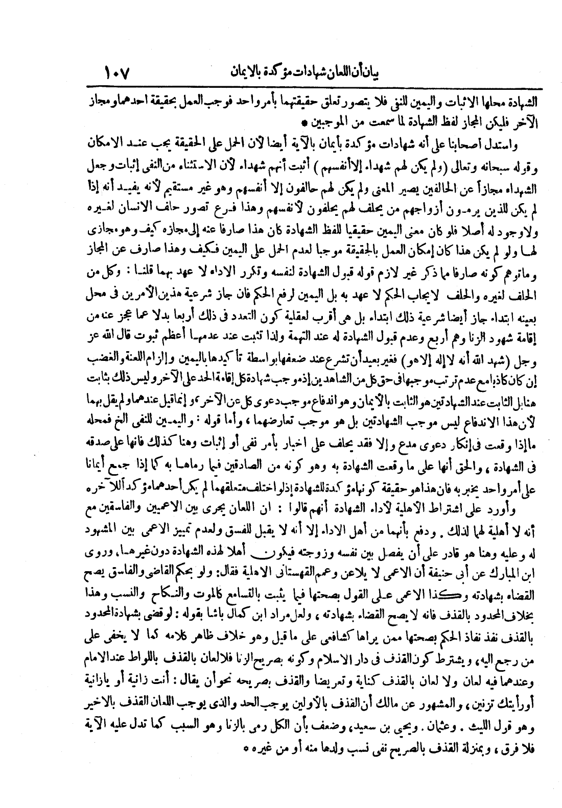 واستدل أصحابنا على أن شهادات مؤكدة بأيمان بالآية أيضا لأن الحمل على الحقيقة يجب عند الإمكان وقوله سبحانه وتعالى ولم يكن لهم شهداء إلا أنفسهم أثبت أنهم شهداء لأن الإستثناء من النفي إثبات وجعل الشهداء مجازا عن الحالفين يصير المعنى ولم يكن لهم حالفون إلا أنفسهم وهو غير مستقيم لأنه يفيد أنه إذا لم يكن للذين يرمون أزواجهم من يحلف لهم يحلفون لأنفسهم وهذا فرع تصور حلف الإنسان لغيره ولا وجود له أصلا فلو كان معنى اليمين حقيقيا للفظ الشهادة كان هذا صارفا عنه إلى مجازه كيف وهو مجازي لها ولو لم يكن هذا كان إمكان العمل بالحقيقة موجبا لعدم الحمل على اليمين فكيف وهذا صارف عن المجاز وما توهم كونه صارفا مما ذكر غير لازم قوله قبول الشهادة لنفسه وتكرر الإداء لا عهد بهما قلنا : وكل من الحلف لغيره والحلف لا يجاب الحكم لا عهد به بل اليمين لرفع الحكم فإن جاز شرعية هذين الأمرين في محل بعينه ابتداء جاز أيضا شرعية ذلك ابتداء بل هي أقرب لعقلية كون التعدد في ذلك أربعا بدلا عما عجز عنه من إقامة شهود الزنا وهم أربع وعدم قبول الشهادة له عند التهمة ولذا تثبت عند عدمها أعظم ثبوت قال الله عز و جل شهد الله أنه لا إله إلا هو فغير بعيد أن تشرع عند ضعفها بواسطة تأكيدها باليمين وإلزام اللعنة والغضب إن كان كاذبا مع عدم ترتب موجبها في حق كل من الشاهدين إذ موجب شهادة كل إقامة الحد على الآخر وليس ذلك بثابت هنا بل الثابت عند الشهادتين هو الثابت بالإيمان وهو اندفاع موجب دعوى كل عن الآخر وإنما قيل عندهما ولم يقل بهما لأن هذا الإندفاع ليس موجب الشهادتين بل هو موجب تعارضهما وأما قوله : واليمين للنفي الخ فحمله ما إذا وقعت في إنكار دعوى مدع وإلا فقد يحلف على إخبار بأمر نفي أو إثبات وهنا كذلك فإنها على صدقه في الشهادة والحق أنها على ما وقعت الشهادة به وهو كونه من الصادقين فيما رماها به كما إذا جمع أيمانا على أمر واحد يخبر به فإن هذا هو حقيقة كونها مؤكدة للشهادة إذ لو اختلف متعلقهما لم يكن أحدهما مؤكدا للآخر