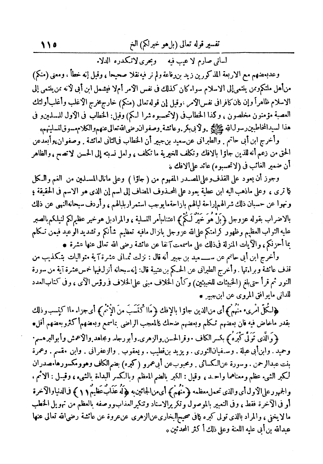 لساني صارم لا عيب فيه وبحري لاتدركه الدلاء وعد بعضهم مع الأربعة المذكورين زيد بن رفاعة ولم نر فيه نقلا صحيحا وقيل إنه خطأ ومعنى منكم من أهل ملتكم وممن ينتمي إلى الإسلام سواء كان كذلك في نفس الأمر أم لا فيشمل ابن أبي لأنه ممن ينتمي إلى الإسلام ظاهرا وإن كان كافرا في نفس الأمر : وقيل إن قوله تعالى منكم خارج مخرج الأغلب وأغلب أولئك العصبة مؤمنون مخلصون وكذا الخطاب في لا تحسبوه شرا لكم وقيل : الخطاب في الأول للمسلمين وفي هذا لسيد المخاطبين رسول الله صلى الله عليه و سلم ولأبي بكر وعائشة وصفوان رضي الله تعالى عنهم والكلام مسوق لتسليتهم