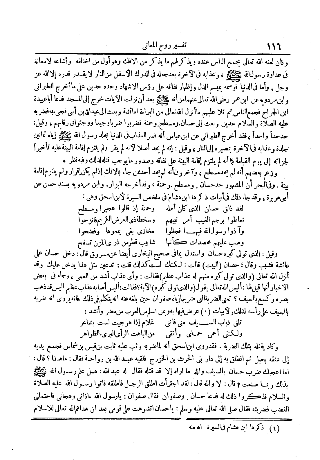 وزعم بعضهم أنه لم يحد مسطح وآخرون أنه لم يحد أحد ممن جاء بالإفك إذ لم يكن إقرار ولم يلتزم إقامة بينة وفي البحر أن المشهور حد حسان ومسطح وحمنة وقد أخرجه البزاز زابن مردوية بسند حسن عن أبي هريرة وقد جاء ذلك في أبيات ذكرها ابن هشام في ملخص السيرة لأبن إسحاق وهي : لقد ذاق حسان الذي كان أهله وحمنة إذ قالوا هجيرا ومسطح تعاطوا برجم الغيب أمر نبيهم وسخطه ذي العرش الكريم فأنزحوا وآذوا رسول الله فيها فجللوا مخازي بغي يمموها وفضحوا وصب عليهم محصدات كأنها شابيب قطر من ذرى المزن تسفح وقيل : الذي تولى كبره حسان واستدل بما في صحيح البخاري أيضا عن مسروق قال : دخل حسان على عائشة فشبب وقال حصان البيت قالت : لكنك لست كذلك قلت : تدعين مثل هذا يدخل عليك وقد أنزل الله تعالى والذي تولى كبره منهم له عذاب عظيم : وأي عذاب أشد من العمى وجاء في بعض الأخبار أنها قيل لها : أليس الله تعالى يقول والذي تولى كبره الآية فقالت : أليس أصابه عذاب عظيم أليس قد ذهب بصره وكسع بالسيف تعني الضربة التي ضربها إياه صفوان حين بلغه عنه أنه يتكلم في ذلك فإنه يروى أنه ضربه بالسيف على رأسه لذلك ولأبيات عرض فيها به وبمن أسلم من العرب من مضر وأنشد : تلق ذباب السيف مني فإنني غلام إذا هوجيت لست بشاعر ولكنني أحمى حماي وأتقي من الباهت الرأي البريء الظواهر وكاد يقتله بتلك الضربة فقد روي ابن إسحاق أنه لما ضربه وثب عليه وثابت بن قيس بن شماس فجمع يديه إلى عنقه بحبل ثم انطلق به إلى دار بني الحرث بن الخزرج فلقيه عبد الله بن رواحة فقال : ما هذا قال : أما أعجبك ضرب حسان بالسيف والله ما أراه إلا قد قتله فقال له عبد الله : هل علم رسول الله صلى الله عليه و سلم بذلك وبما صنعت قال : لا والله قال : لقد اجترأت أطلق الرجل فأطلقه فأتوا رسول الله عليه الصلاة و السلام فذكروا ذلك له فدعا حسان وصفوان فقال صفوان : يا رسول الله آذاني وهجاني فاحتملني الغضب فضربته فقال صلى الله تعالى عليه وسلم : يا حسان أتشوهت على قومي بعد أن هداهم الله تعالى للإسلام