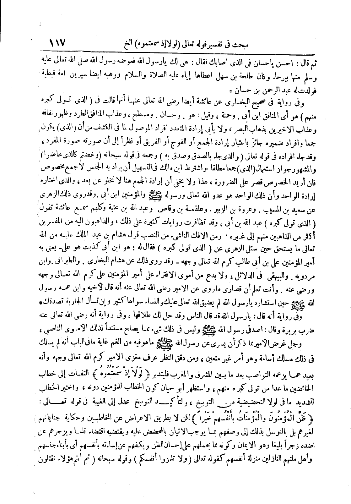 وفي رواية أنه قال : يا رسول الله قد قال الناس وقد حل لك طلاقها وفي رواية أنه رضي الله تعالى عنه ضرب بريرة وقال : أصدقي رسول الله صلى الله عليه و سلم وليس في ذلك شيء مما يصلح مستندا لذلك الأموي الناصبي وجل غرض الأمير مما ذكر أن يسري عن رسول الله صلى الله عليه و سلم ما هو فيه من الغم غاية ما في الباب أنه لم يسلك في ذلك مسلك أسامة وهو أمر غير متعين ومن دقق النظر عرف مغزى الأمير كرم الله تعالى وجهه وأنه بعيد عما يزعمه النواصب بعد ما بين المشرق والمغرب فليتدبر لو لا إذ سمعتموه التفات إلى خطاب الخائضين ما عدا من تولى كبره منهم واستظر أبو حيان كون الخطاب للمؤمنين دونه واختير الخطاب لتشديد ما في لو لا التحضيضية من التوبيخ ولتأكيد التوبيخ عدل إلى الغيبة في قوله تعالى : ظن المؤمنون والمؤمنات بأنفسهم خيرا لكن لا بطريق الإعراض عن المخاطبين وحكاية جناياتهم لغيرهم بل بالتوسل بذلك إلى وصفهم بما يوجب الإتيان بالمحض عليه ويقتضيه اقتضاء تاما ويزجرهم عن ضده زجرا بليغا وهو الإيمان وكونه يحملهم على إحسان الظن ويكفهم عن إساءته بأنفسهم أي بأنباء جنسهم وأهل ملتهم النازلين منزلة أنفسهم كقوله تعالى ولا تلمزوا أنفسكم وقوله سبحانه ثم أنتم هؤلاء تقتلون