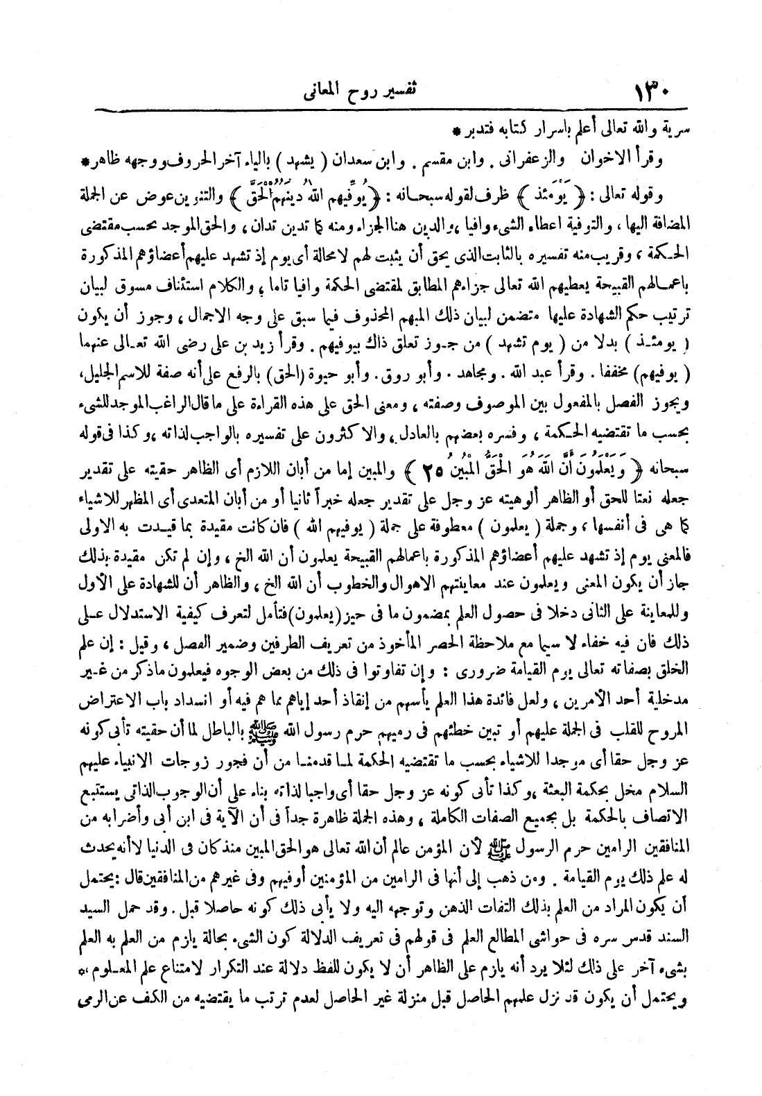 - والمبين إما من أبان اللازم أي الظاهر حقيته على تقدير جعله نعتا للحق أو الظاهر ألوهيته عز و جل على تقدير جعله خبرا ثانيا أو من أبان المتعدي أي المظهر للأشياء كما في أنفسها وجملة يعملون معطوفة على جملة يوفيهم الله فإن كانت مقيدة بما قيدت به الأولى فالمعنى يوم إذ تشهد عليهم أعضاؤهم المذكورة بأعمالهم القبيحة يعلمون أن الله الخ وإن لم تكن مقيدة بذلك جاز أن يكون المعنى ويعلمون عند معاينتهم الأهوال والخطوب أن الله الخ والظاهر أن للشهادة على الأول وللمعاينة على الثاني دخلا في صحول العلم بمضمون ما في حيز يعلمون فتأمل لتعرف كيفية الإستدلال على ذلك فإن فيه خفاء لا سيما مع ملاحظة الحصر المأخوذ من تعريف الطرفين وضمير الفصل وقيل : إن علم الخلق بصفاته تعالى يوم القيامة ضروري : وإن تفاوتوا في ذلك من بعض الوجوه فيعلمون ما ذكر من غير مدخلية أحد الأمرين ولعل فائدة هذا العلم يأسهم من إنقاذ أحد إياهم مما هم فيه أو انسداد باب الإعتراض المروح للقلب في الجملة عليهم أو تبين خطئهم فر رميهم حرم رسول الله صلى الله عليه و سلم بالباطل لما أن حقيته تأبى كونه عز و جل حقا أي موجدا للأشياء بحسب ما تقتضيه الحكمة لما قدمنا من أن فجور زوجات الأنبياء عليهم السلام مخل بحكمة البعثة وكذا تأبى كونه عز و جل حقا أي واجبا لذاته بناء على أن الوجوب الذاتي يستتبع الإتصاف بالحكمة بل بجميع الصفات الكاملة وهذه الجملة ظاهرة جدا في أن الآية في ابن أبي وأضرابه من المنافقين الرامين حرم الرسول صلى الله عليه و سلم لأن المؤمن عالم أن الله تعالى هو الحق المبين منذ كان في الدنيا لا أنه يحدث له علم ذلك يوم القيامة ومن ذهب إلى أنها في الرامين من المؤمنين أو فيهم وفي غيرهم من المنافقين قال : يحتمل أن يكون المراد من العلم بذلك التفات الذهن وتوجهه إليه ولا يأبى ذلك كونه حاصل قبل وقد حمل السيد السند قدس سره في حواشي المطالع العلم في قولهم في تعريف الدلالة كون الشيء بحالة يلزم من العلم به العلم بشيء آخر على ذلك لئلا يرد أنه يلزم على الظاهر أن لا يكون اللفظ دلالة عند التكرار لامتناع علم المعلوم