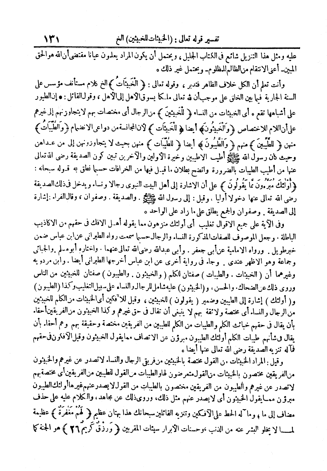 أي الخبيثات من النساء للخبيثين ومن الرجال أي مختصات بهم لا يتجاوزنهم إلى غيرهم على أن اللام للإختصاص والخبيثون أيضا للخبيثات لأن المجانسة من دواعي الإنضمام والطيبات منهن للطيبين منهم والطيبون أيضا للطيبات منهن بحيث لا يتجاوزونهن إلى من عداهن وحيث كان رسول الله صلى الله عليه و سلم أطيب الأطيبين وخيرة الأولين والآخرين تبين كون الصديقة رضي الله تعالى عنها من أطيب الطيبات بالضرورة واتضح بطلان ما قيل فيها من الخرافات حسبما نطق به قوله سبحانه : أولئك مبرءون مما يقولون على أن الإشارة إلى أهل البيت النبوي رجالا ونساء ويدخل في ذلك الصديقة رضي الله تعالى عنها دخولا أوليا وقيل : إلى رسول الله صلى الله عليه و سلم والصديقة وصفوان وقال الفراء : إشارة إلى الصديقة وصفوان والجمع يطلق على ما زاد على الواحد