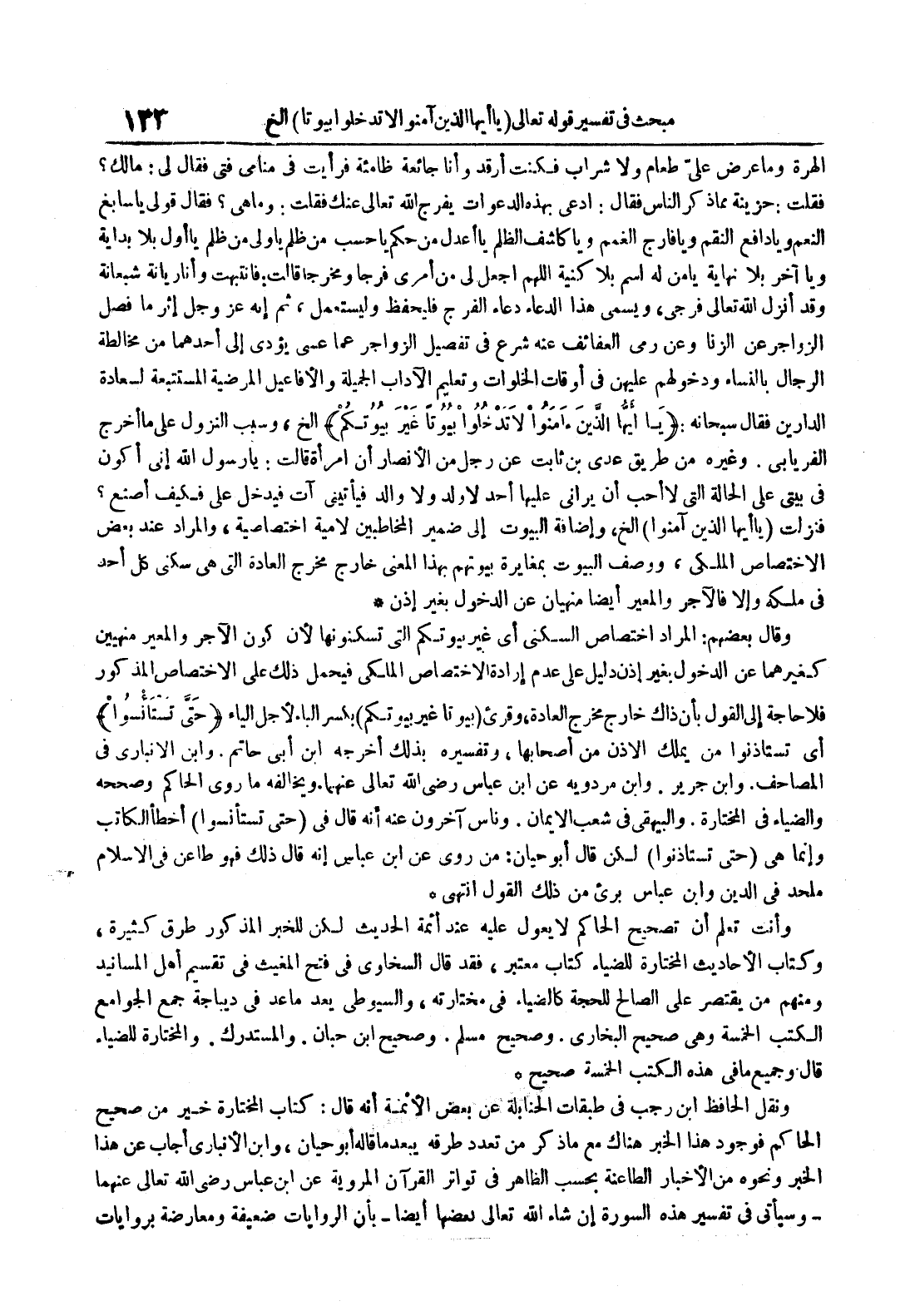 الهرة وما عرض علي طعام ولا شراب فكنت أرقد وأنا جائعة ظامئة فرأيت في منامي فتى فقال لي : ما لك فقلت : حزينة مما ذكر الناس فقال : ادعي بهذه الدعوات يفرج الله تعالى عنك فقلت : وما هي فقال : قولي يا سابغ النعم ويا دافع النقم ويا فارج الغمم ويا كاشف الظلم يا أعدل من حكم يا حسب من ظلم يا ولي من ظلم يا أول بلا بداية ويا آخر بلا نهاية يا من له اسم بلا كنية اللهم اجعل لي من أمري فرجا ومخرجا قالت : فانتبهت وأنا ريانة شبعانة وقد أنزل الله تعالى فرجي ويسمى هذا الدعاء دعاء الفرج فليحفظ وليستعمل ثم إنه عز و جل إثر ما فصل الزواجر عن الزنا وعن رمي العفائف عنه شرع في تفصيل الزواجر عما عسى يؤدي إلى أحدهما من مخالطة الرجال بالنساء ودخولهم عليهن في أوقات الخلوات وتعليم الآداب الجميلة والأفاعيا المرضية المستتبعة لسعادة الدارين فقال سبحانه : يا أيها الذين آمنوا لا تدخلوا بيوتا غير بيوتكم الخ وسبب النزول على ما أخرج الفريابي وغيره من طريق عدي بن ثابت عن رجل من الأنصار أن امرأة قالت : يا رسول الله إني أكون في بيتي على الحالة التي لا أحب أن يراني عليها أحد لا ولد ولا والد فيأتيني آت فيدخل علي فكيف أصنع فنزلت يا أيها الذين آمنوا اله وإضافة البيوت إلى ضمير المخاطبين لامية اختصاصية والمراد عند بعض الإختصاص الملكي ووصف البيوت بمغايرة بيوتهم بهذا المعنى خارج مخرج العادة التي هي سكني كل أحد في ملكه وإلا فالآجر والمعير أيضا منهيان عن الدخول بغير إذن