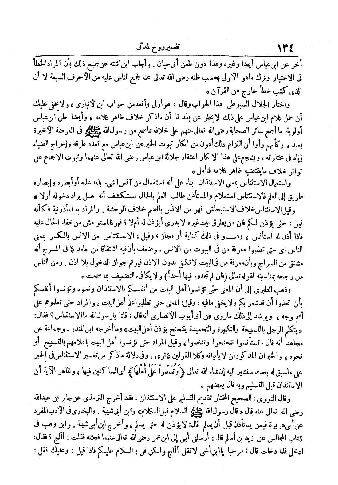 وذهب الطبري إلى أن المعنى حتى تؤنسوا أهل البيت من أنفسكم بالإستئذان ونحوه وتؤنسوا أنفسكم بان تعلموا أن قد شعر بكم ولا يخفى ما فيه وقيل : المعنى حتى تطلبوا علم أهل البيت والمراد حتى تعلموهم على أتم وجه ويرشد إلى ذلك ما روي عن أبي أيوب الأنصاري أنه قال : يا رسول الله ما الإستئناس فقال : يتكلم الرجل بالتسبيحة والتكبيرة والتحميدة يتنحنح يؤذن أهل البيت وما أخرجه ابن المنذر وجماعة عن مجاهد أنه قال تستأنسوا تنحنحوا وتنخموا وقيل المراد حتى تؤنسوا أهل البيت بإعلامهم بالتسبيح أو نحوه والخبران المذكوران لا يأبيانه وكلا القولين كما ترى وفي دلالة ما ذكر من تفسير الإستئناس في الخبر على ما سبق له بحث سنشير إليه إن شاء الله تعالى وتسلموا على أهلها أي الساكنين فيها وظاهر الآية أم الإستئذان قيل التسليم وبه قال بعضهم