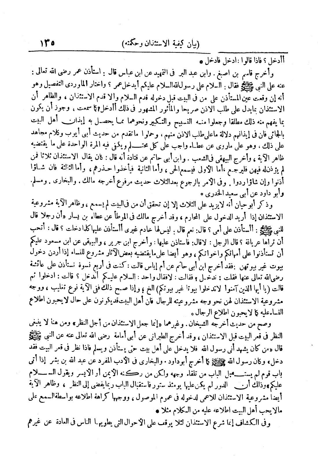 وذكر أبو حيان أنه لا يزيد على الثلاث إلا إن تحقق أن في البيت لم يسمع وظاهر الآية مشروعية الإستئذان إذا أريد الدخول على المحارم وقد أخرج مالك في الموطأ عن عطاء بن يسار أن رجلا قال للنبي صلى الله عليه و سلم : أأستأذن على أمي قال : نعم قال : ليس لها خادم غيري أأستأذن عليها كلما دخلت قال : أتحب أن تراها عريانة قال الرجل : لا قال : فاستأذن عليها : وأخرج ابن جرير والبيهقي عن ابن مسعود عليكم أن تستأذنوا أمهاتكم وأخواتكم وهو أيضا على ما يقتضيه بعض الآثار مشروع للنساء إذ أردن دخول بيوت غير بيوتهن : فقد أخرج ابن أبي حاتم عن أم إياس قالت : كنت في أربع نسوة نستأذن على عائشة رضي الله تعالى عنها فقلت : ندخل فقالت : لا فقال واحد : السلام عليكم أندخل قالت : ادخلوا ثم قالت يا أيها الذين آمنوا لاتدخلوا بيوتا غير بيوتكم الخ وإذا صح ذلك ففي الآية نوع تغليب ووجه مشروعية الإستئذان لهن نحو وجه مشروعيته للرجال فإن أهل البيت قد يكونون على حال لا يحبون اطلاع النساء كما لا يحبون اطلاع الرجال