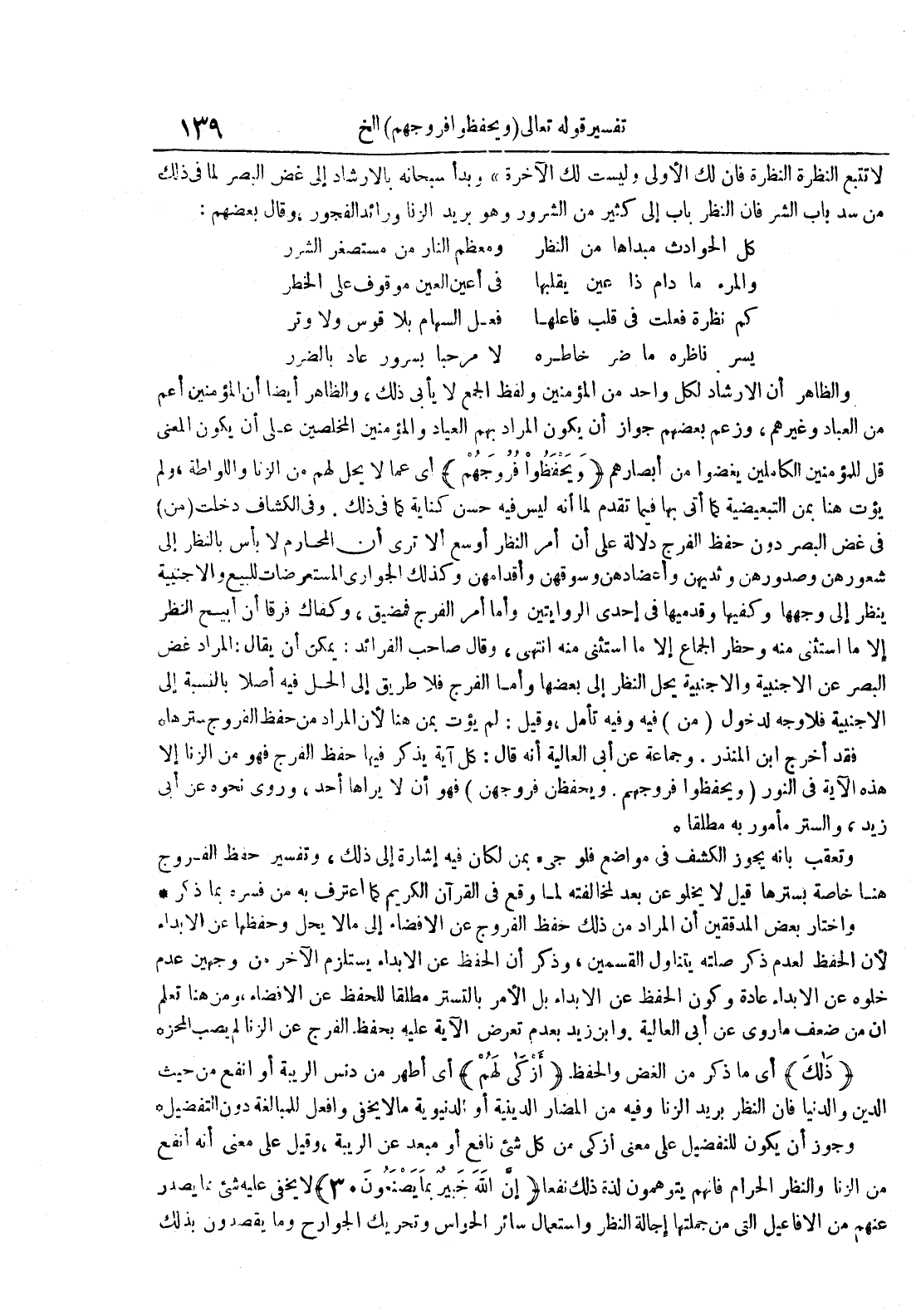 لا تتبع النظرة النظرة فإن لك الأولى وليست لك الآخرة وبدأ سبحانه بالإرشاد إلى غض البصر لما في ذلك من سد باب الشر فإن النظر باب إلى كثير من الشرور وهو بريد الزنا ورائد الفجور وقال بعضهم : كل الحوادث مبداها من النظر ومعظم النار من مستصغر الشرر والمرء ما دام ذا عين يقلبها في أعين العين موقوف على الخطر كم نظرة فعلت في قلب فاعلها فعل السهام بلا قوس ولا وتر يسر ناظره ما ضر خاطره لا مرحبا بسرور عاد بالضرر والظاهر أن الإرشاد لكل واحد من المؤمنين ولفظ الجمع لا يأبى ذلك والظاهر أيضا أن المؤمنين أعم من العباد وغيرهم وزعم بعضهم جواز أن يكون المراد بهم العياد والمؤمنين المخلصين على أن يكون المعنى قل للمؤمنين الكاملين يغضوا من أبصارهم ويحفظوا فروجهم أي عما لا يحل لهم من الزنا واللواطة ولم يؤت هنا بمن التبعيضية كما أتى بها فيما تقدم لماأنه ليس فيه حسن كناية كما في ذلك وفي الكشاف دخلت من في غض البصر دون الفرج دلالة على أن أمر النظر أوسع ألا ترى أن المحارم لا بأس بالنظر إلى شعورهن ووصدورهن وثديهن وأعضادهن وسوقهن وأقدامهن وكذلك الجواري المستعرضات للبيع والأجنبية ينظر إلى وجهها وكفيها وقدميها في إحدى الروايتين وأما أمر الفرج فمضيق وكفاك فرقا أن أبيح النظر إلا ما إستثنى منه وحظر الجماع إلا ما استثنى منه انتهى وقال صاحب الفرائد : يمكن أن يقال : المراد غض البصر عن الأجنبية والأجنبية يحل النظر إلى بعضها وأما الفرج فلا طريق إلى الحل فيه أصلا بالنسبة إلى الأجنبية فلا وجه لدخول من فيه وفيه تأمل وقيل : لم يؤت بمن هنا لأن المراد من حفظ الفروج سترها