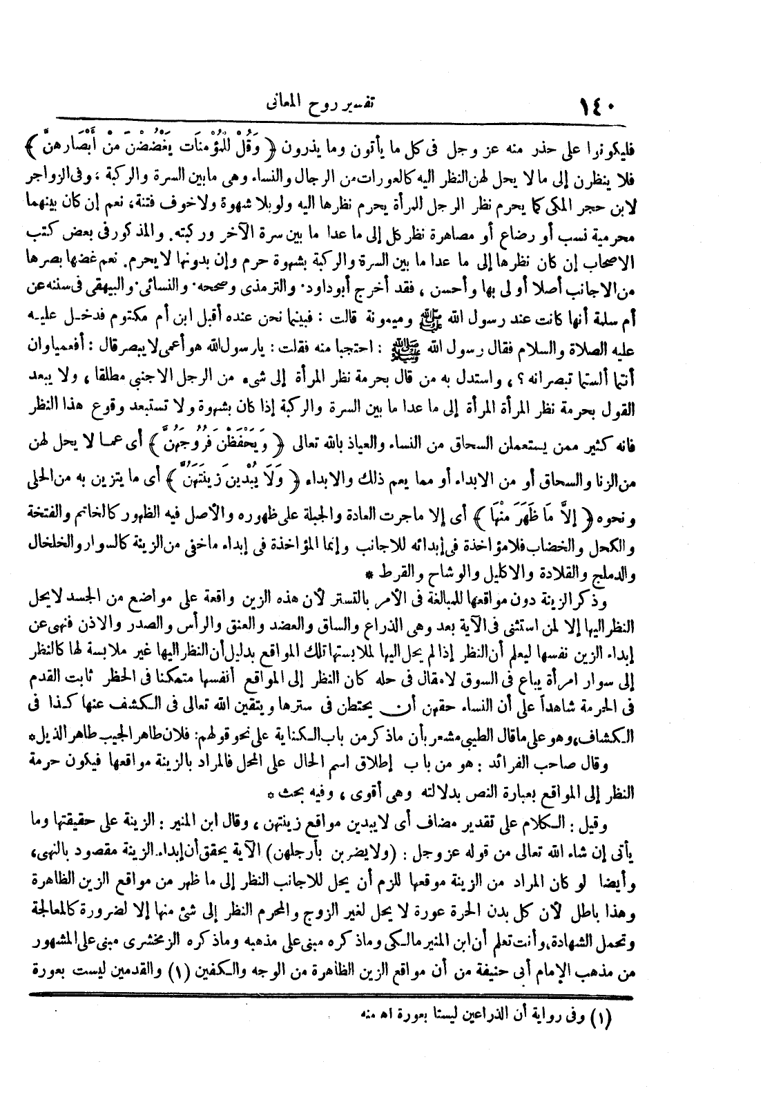 فليكونوا على حذر منه عز و جل في كل ما يأتون وما يذرون وقل للمؤمنات يغضضن من أبصارهن فلا ينظرن إلى ما لا يحل لهن النظر إليه كالعورات من الرجال والنساء وهي ما بين السرة والركبة وفي الزواجر لابن حجر المكي يحرم نظر الرجل للمرأة يحرم نظرها إليه ولو بلا شهوة ولا خوف فتنة نعم إن كان بينهما محرمية نسب أو رضاع أو مصاهرة نظر كل إلى ما عدا ما بين سرة الآخر وركبته والمذكور في بعض كتب الأصحاب إن كان نظرها إلى ما عدا ما بين السرة والركبة بشهوة حرم وإن بدونها لا يحرك نعم غضها بصرها من الأجانب أصلا أولى بها وأحسن فقد أخرج أبو داود والترمذي وصححه النسائي والبيهقي في سننه عن أم سلمة أنها كانت عند رسول الله صلى الله عليه و سلم وميمونة قالت : فبينما نحن عنده أقبل ابن أم مكتوم فدخل عليه عليه الصلاة و السلام فقال رسول الله صلى الله عليه و سلم : احتجبا منه فقلت : يا رسول الله هو أعمى لا يبصر قال : أفعميا وإن أنتما ألستما تبصرانه واستدل به من قال بحرمة نظر المرأة إلى شيء من الرجل الأجنبي مطلقا ولا يبعد القول بحرمة نظر المرأة المرأة إلى ما عدا ما بين السرة والركبة إذا كان بشهوة ولا تستبعد وقوع هذا النظر فإنه كثير ممن يستعملن السحاق من النساء والعياذ بالله تعالى ويحفظن فروجهن أي عما لا يحل لهن من الزنا والسحاق أو من الإبداء أو مما يعم ذلك والإبداء ولا يبدين زينتهن أي ما يتزين به من الحلي ونحوه إلا ما ظهر منها أي إلا ما جرت العادة والجبلة على ظهوره والأصل فيه الظهور كالخاتم والفتخة والكحل والخضاب فلا مؤاخذة في إبدائه للأجانب وإنما المؤاخذة في إبداء ما خفي من الزينة كالسوار الخلخال والدملج والقلادة والإكليل والوشاح والقرط