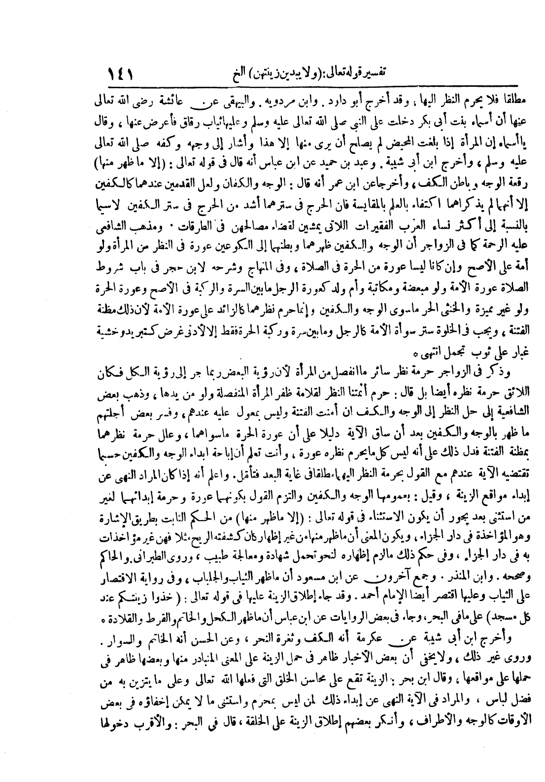 وذكر في الزواجر حرمة نظر سائر ما انفصل من المرأة لأن رؤية البعض ربما جر إلى رؤية الكل فكان اللائق حرمة نظره أيضا بل قال : حرم أئمتنا النظر لقلامة ظغر المرأة المنفصلة ولو من يدها وذهب بعض الشافعية إلى حل النظر إلى الوجه والكف إن أمنت الفتنة وليس بمعول عليه عندهم وفسر بعض أجلتهم ما ظهر بالوجه والكفين بعد أن ساق الآية دليلا على أن عورة الحرة ما سواهما وعلل حرمة نظرهما بمظنة الفتنة فدل ذلك على أنه ليس كل ما يحرم نظره عورة وأنت تعلم أن إباحة إبداء الوجه والكفين حسبما تقتضيه الآية عندهم مع القول بحرمة النظر إليهما مطلقا في غاية البعد فتأمل واعلم أنه إذا كان المراد النهي عن إبداء مواقع الزينة وقيل : بعمومها الوجه والكفين والتزم القول بكونهما عورة وحرمة إبدائهما لغير من استثنى بعد أن يجور أن يكون الإستثناء في قوله تعالى : إلا ما ظهر منها من الحكم الثابت بطريق الإشارة وهو المؤاخذة في دار الجزاء ويكون المعنى أن ما ظهر منها من غير إظهار كان كشفته الريح مثلا فهن غير مؤاخذات به في دار الجزاء وفي حكم ذلك ما لزم إظهاره لنحو تحمل شهادة شهادة ومعالجة طبيب وروري الطبراني والحاكم وصححه وابن المنذر وجمع آخرون عن ابن مسعود أن ما ظهر الثياب والجلباب وفي رواية الإقتصار على الثياب وعليها اقتصر أيضا الإمام أحمد وقد جاء إطلاق الزينة عليها في قوله تعالى : خذوا زينتكم عند كل مسجد على ما في البحر وجاء في بعض الروايات عن ابن عباس أن ما ظهر الكحل والخاتم والقرط والقرادة