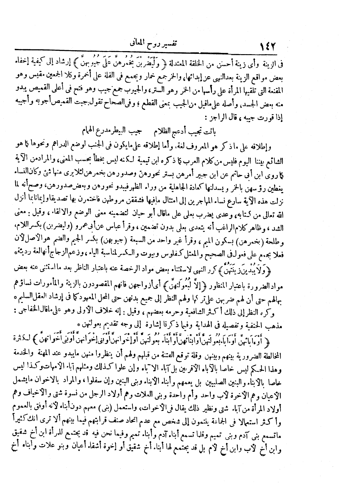 في الزينة وأي زينة أحسن من الخلقة المعتدلة وليضربن بخمرهن على جيوبهن إرشاد إلى كيفية إخفاء بعض مواقع الزينة بعد النهي عن إبدائها والخمر جمع خمار ويجمع في القلة على أخمرة وكلا الجمعين مقيس وهو المقنعة التي تلقيها المرأة على رأسها من الخمر وهو الستر والجيوب جمع جيب وهو فتح في أعلى القميص يبدو منه بعض الجسد وأصله على ما قيل من الجيب بمعنى القطع وفي الصحاح تقول : جيب القميص أجوبه وأجيبه إذا قورت جيبه قال الراجز : باتت تجيب أدعج الظلام جيب البيطر مدرع الهمام وإطلاقه على ما ذكر هو المعروف لغة وأما إطلاقه على ما يكون في الجنب لوضع الدراهم ونحوها كما هو الشائع بيننا اليوم فليس من كلام العرب كما ذكره ابن تيمية لكنه ليس بخطأ بحسب المعنى والمراد من الآية كما روي ابن أبي حاتم عن ابن جبير أمرهن بستر نحورهن وصدورهن بخمرهن لئلا يرى منها شيء وكان النساء يغطين رؤسهن بالخمر ويسدلنها كعادة الجاهلية من وراء الظهر فيبدو نحورهن وبعض صدورهن وصح أنه لما نزلت هذه الآية سارع نساء المهاجرين إلى امتثال ما فيها فشقق مروطهن فاختمرن بها تصديقا وإيمانا بما أنزل الله تعالى من كتابه وعدي يضرب بعلي على ما قال أبو حيان لتضمينه معنى الوضع والإلقاء وقيل : معنى الشد وظاهر كلام الراغب أنه يتعدى بعلى بدون تضمين وقرأ عباس عن أبي عمرو وليضربن بكسر اللام وطلحة بخمرهن بسكون الميم وقرأ غير واحد من السبعة جيوبهن بكسر الجيم والضم هو الأصل لأن فعلا يجمع على فعول في الصحيح والمعتل كفلوس وبيوت والكسر لمناسبة الياء وزعم الزجاج أنها لغة رديئة
