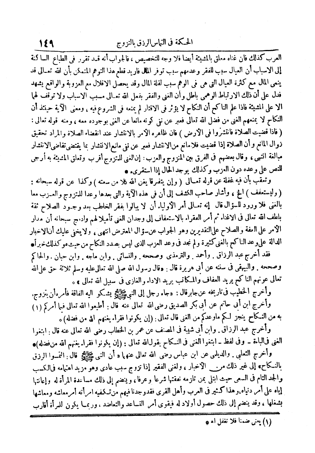 وأخرج عبد الرزاق وابن أبي شيبة في المصنف عن عمر بن الخطاب رضي الله تعالى عنه قال : ابتغوا الغنى في الباءة وفي لفظ ابتغوا الغنى في النكاح يقول الله تعالى : إن يكونوا فقراء يغنهم الله من فضله