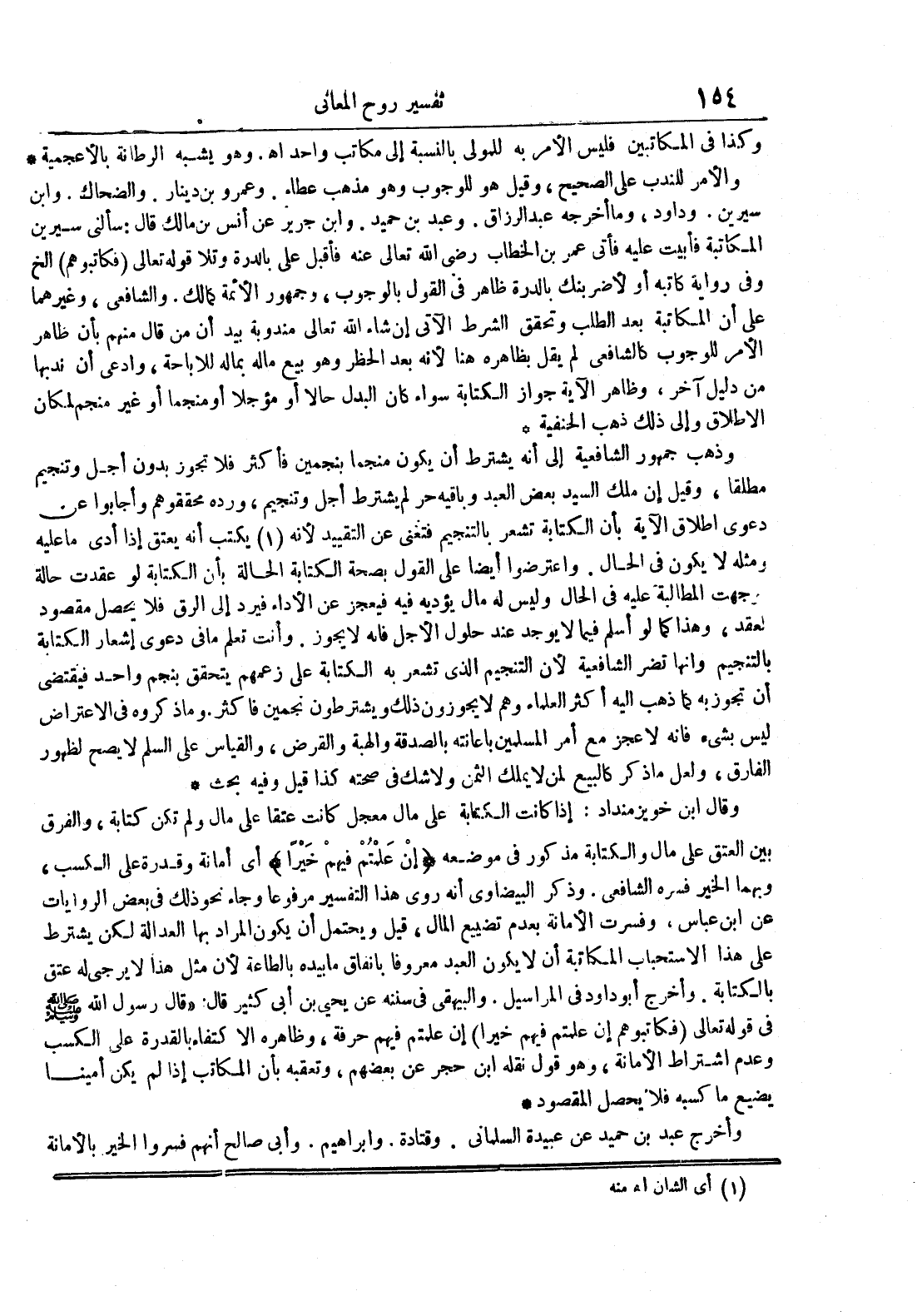 وقال ابن خويز منداد : إذا كانت الكتابة على مال معجل كانت عتقا على مال ولم تكن كتابة والفرق بين العتق على مال والكتابة مذكور في موضعه إن علمتم فيهم خيرا أي أمانة وقدرة على الكسب وبهما الخير فسره الشافعي وذكره البيضاوي أنه روي هذا التفسير مرفوعا وجاء نحو ذلك في بعض الروايات عن ابن عباس وفسرت الأمانة بعدم تضييع المال وقيل ويحتمل أن يكون المراد بها العدالة لكن يشترط على الإستحباب المكاتبة أن لا يكون العبد معروفا بإنفاق ما بيده بالطاعة لأن مثل هذا لا يرجى له عتق بالكتابة وأخرج أبو داود في المراسيل والبيهقي في سننه عن يحيى بن أبي كثير قال : قال رسول الله صلى الله عليه و سلم في قوله تعالى فكاتبوهم إن علمتم فيهم خيرا إن علمتم فيهم حرفة وظاهره الإكتفاء بالقدرة على الكسب وعدم اشتراط الأمانة وهو قول نقله ابن حجر عن بعضهم وتعقبه بأن المكاتب إذا لم يكن أمينا يضيع ما كسبه فلا يحصل المقصود