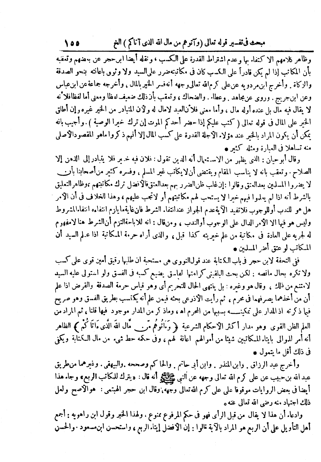 وظاهر كلامهم الإكتفاء بها وعدم اشتراط القدرة على الكسب ونقله أيضا ابن حجر عن بعضهم وتعقبه بأن المكاتب إذا لم يكن قادرا على الكسب كان في مكاتبته ضرر على السيد ولا وثوق بإعانته بنحو الصدقة والزكاة وأخرج ابن مردوية عن علي كرم الله تعالى وجهه أنه فسر الخير بالمال وأخرجه جماعة عن ابن عباس وعن ابن جريج وروي عن مجاهد وعطاء والضحاك وتعقب بأن ذلك ضعيف لفظا ومعنى أما لفظا فلأنه لا يقال فيه مال بل عنده أو له مال وأما معنى فلأن العبد لا مال له ولأن المتبادر من الخير غيره وإن أطلق الخير على المال في قوله تعالى كتب عليكم إذا حضر أحدكم الموت إن ترك خيرا الوصية وأجيب بأنه يمكن أن يكون المراد بالخير عند هؤلاء الأجلة القدرة على كسب المال إلا أنهم ذكروا ما هو المقصود الأصلي منه تساهلا في العبارة ومثله كثير