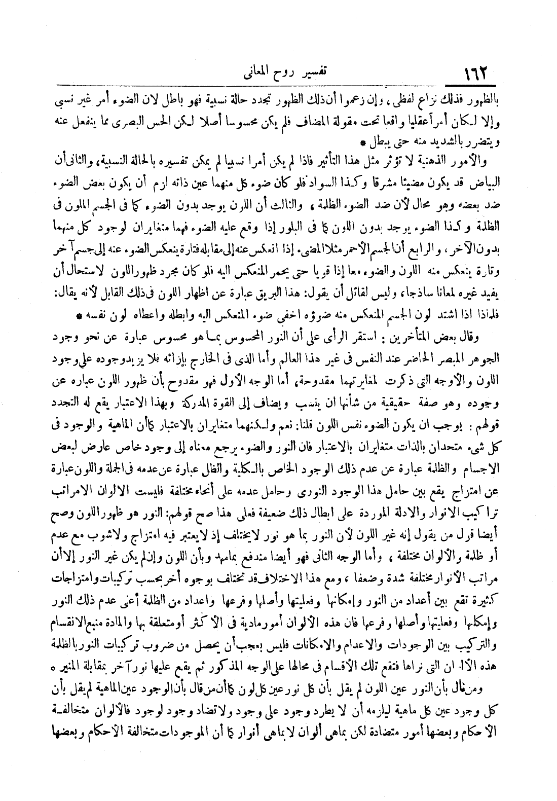 ومن قال بأن النور عين اللون لم يقل بأن كل نور عين كل لون كما أن من قال بأن الوجود عين الماهية لم يقل بأن كل وجود عين كل ماهية ليلزمه أن لا يطرد وجود على وجود ولا تضاد وجود لوجود فالألوان متخالفة الأحكام وبعضها أمور متضادة لكن بما هي ألوان لا بما هي أنوار كما أن الموجودات متخالفة الأحكام وبعضها
