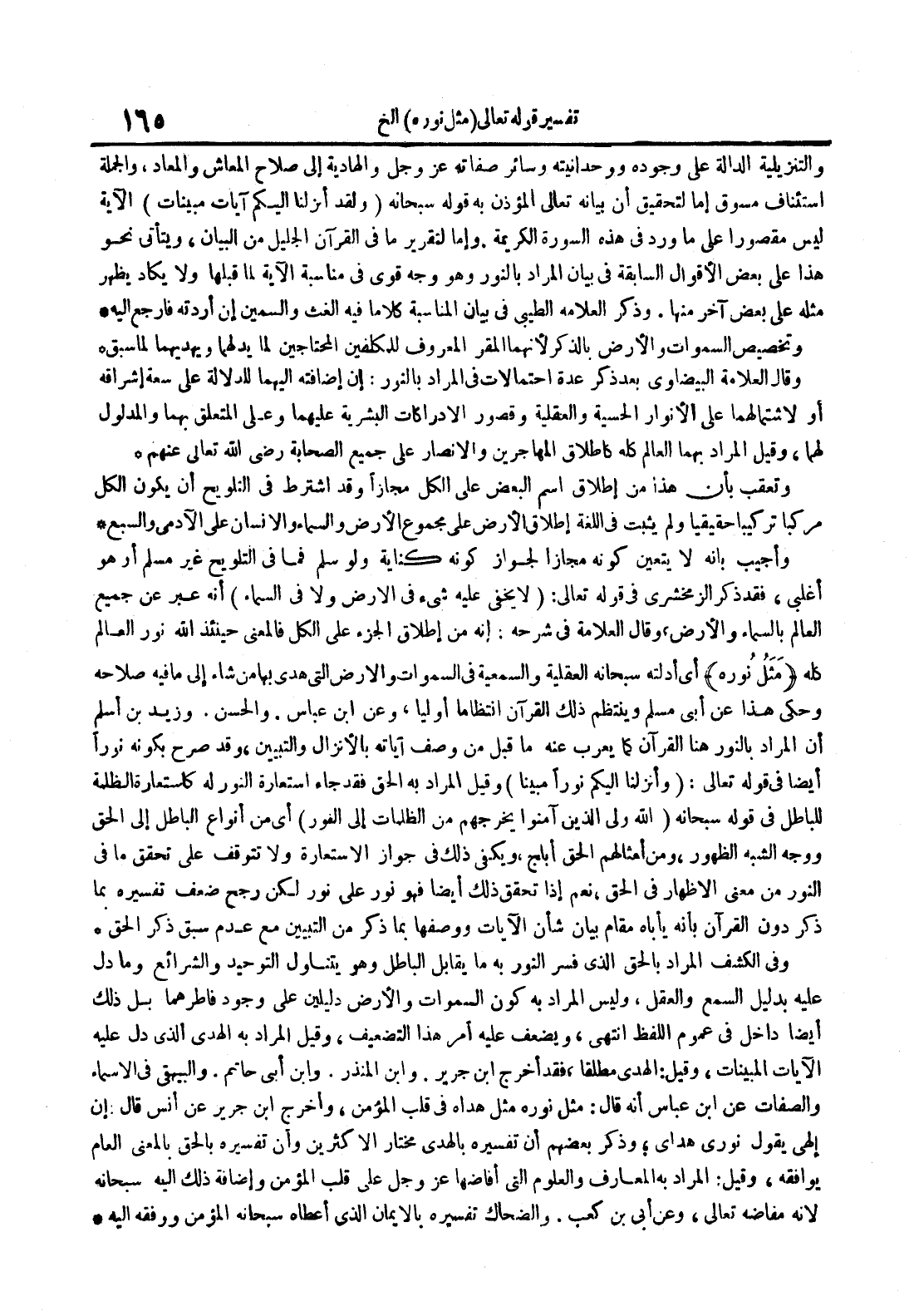 وأجيب بأنه لا يتعين كونه مجازا لجواز كونه كناية ولو سلم فما في التلويح غير مسلم أو هو أغلبي فقد ذكر الزمخشري في قوله تعالى : لا يخفى عليه شيء في الأرض ولا في السماء أنه عبر عن جميع العالم بالسماء والأرض قال العلامة في شرحه : إنه من إطلاق الجزء على الكل فالمعنى حينئذ الله نور العالم كله مثل نوره أي أدلته سبحانه العقلية والسمعية في السماوات والأرض التي هدي بها شاء إلى ما فيه صلاحه وحكى هذا عن أبي مسلم وينتظم ذلك القرآن انتظاما أوليا وعن ابن عباس والحسن وزيد بن أسلم أن المراد بالنور هنا القرآن كما يعرب عنه ما قبل من وصف آياته بالإنزال والتبيين وقد صرح بكونه نورا أيضا في قوله تعالى : وأنزلنا إليكم نورا مبينا وقيل المراد به الحق فقد جاء استعارة النور له كاستعارة الظلمة للباطل في قوله سبحانه الله ولي الذين آمنوا يخرجهم من الظلمات إلى النور أي من أنوار الباطل إلى الحق ووجه الشبه الظهور ومن أمثالهم الحق أبلج ويكفي ذلك في جواز الإستعارة ولا تتوقف على تحقق ما في النور من معنى الإظهار في الحق نعم إذا تحقق ذلك أيضا فهو نور على نور لكن رجح ضعف تفسيره بما ذكر دون القرآن بأنه يأباه مقام بيان شأن الآيات ووصفها بما ذكر من التبيين مع عدم سبق ذكر الحق
