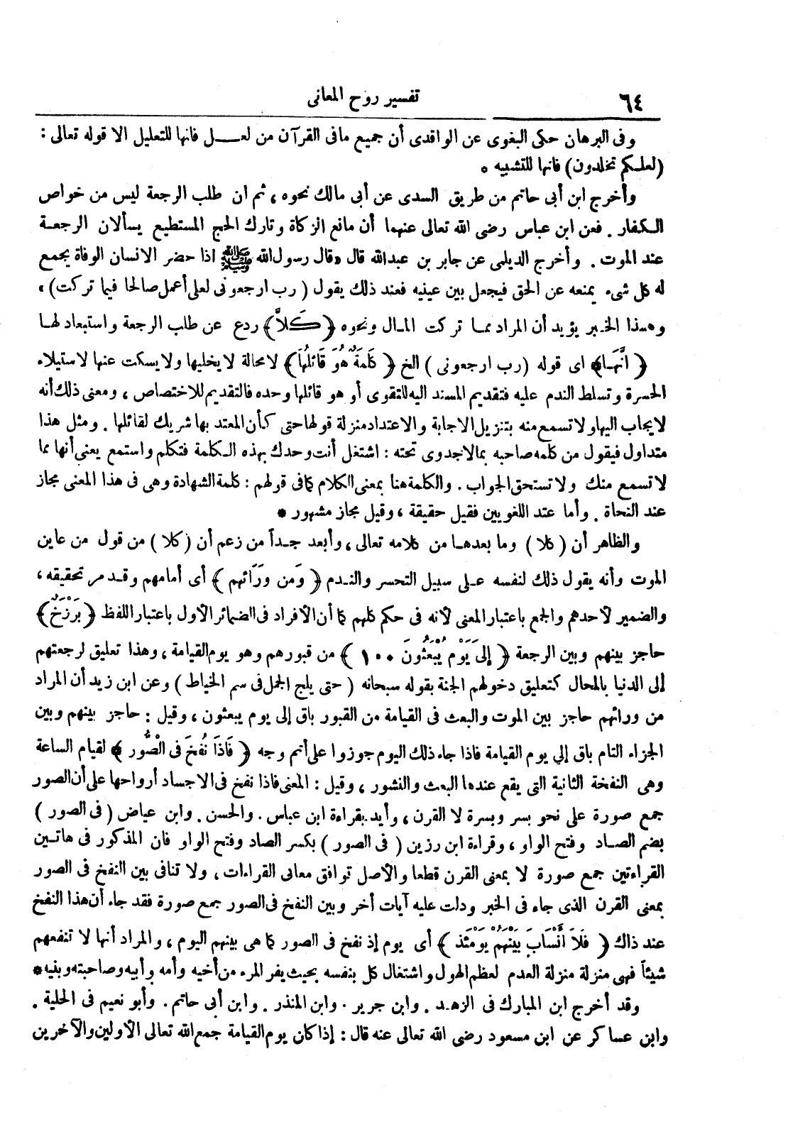 - من قبورهم وهو يوم القيامة وهذا تعليق لرجعتهم إلى الدنيا بالمحال كتعليق دخولهم الجنة بقوله سبحانه حتى يلج الجمل في سم الخياط وعن ابن زيد أن المراد من ورائهم حاجز بين الموت والبعث في القيامة من القبور إلى يوم يبعثون وقيل : حاجز بينهم وبين الجزاء التام باق إلى يوم القيامة فإذا جاء ذلك اليوم جوزوا على أتم وجه فإذا نفخ في الصور لقيام الساعة وهي النفخة الثانية التي يقع عندها البعث والنشور وقيل : المعنى فإذا نفخ في الأجساد أرواحها على أن الصور جمع صورة على نحو بسر وبسرة لا القرن وأيد بقراءة ابن عباس والحسن وابن عياض في الصور بضم الصاد وفتح الواو وقراءة ابن رزين في الصور بكسر الصاد وفتح الواو فإن المذكور في هاتين القاءتين جمع صورة لا بمعنى القرن قطعا والأصل توافق معاني القراءات ولا تنافي بين النفخ في الصور بمعنى القرن الذي جاء في الخبر ودلت عليه أخر وبين النفخ في الصور جمع صورة فقد جاء أن هذا النفخ عند ذاك فلا أنساب بينهم يومئذ أي يوم إذ نفخ في الصور كما هي بينهم اليوم والمراد أنها لا تنفعهم شيئا فهي منزلة منزلة العدم لعظم الهول واشتغال كل بنفسه بحيث يفر المرء من أخيه وأمه وأبيه وصاحبته وبنيه