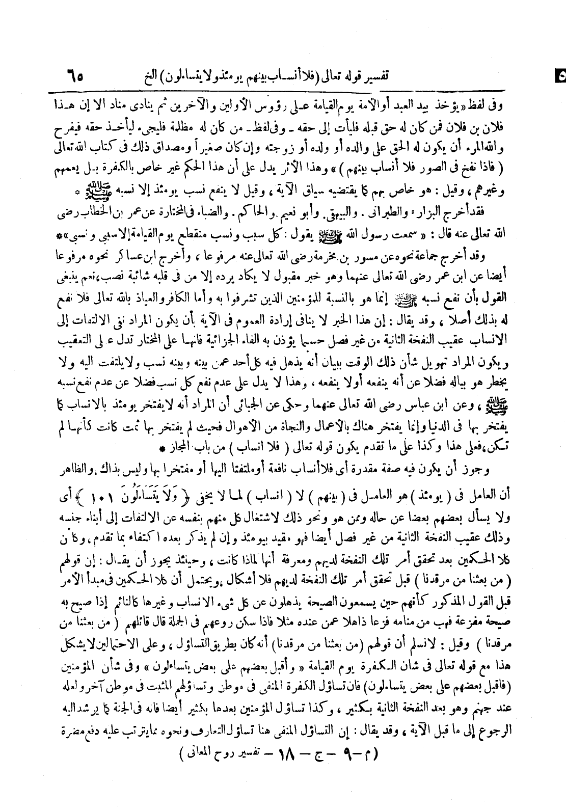 - أي ولا يسأل بعضهم بعضا عن حاله وممن هو ونحو ذلك لاشتغال كل منهم بنفسه عن الإلتفات إلى أبناء جنسه وذلك عقيب النفخة الثانية من غير فصل أيضا فهو مقيد بيومئذ وإن لم يذكر بعده اكتفاء بما تقدم وكان كلا الحكمين بعد تحقيق أمر تلك النفخة لديهم ومعرفة أنها لماذا كانت وحينئذ يجوز أن يقال : إن قولهم من بعثنا من مرقدنا قبل تحقق أمر تلك النفخة لديهم فلا أشكال ويحتمل أن كلا الحكمين في مبدأ الأمر قبل القول المذكور كأنهم حين يسمعون الصيحة يذهلون عن كل شيء الأنساب وغيرها كالنائم إذا صيح به صيحة مفزعة فهب من منامه فزعا ذاهلا عمن عنده مثلا فإذا سكن روعهم في الجملة قال قائلهم من بعثنا من مرقدنا وقيل : لا نسلم أن قولهم من بعثنا من مرقدنا أنه كان بطريق التساؤل وعلى الإحتمالين لا يشكل هذا مع قوله تعالى في شأن الكفرة يوم القيامة وأقبل بعضهم على بعض يتساءلون وفي شأن المؤمنين فأقبل بعضهم على بعض يتساءلون فإن تساؤل الكفرة المنفي في موطن وتساؤلهم المثبت في موطن آخر ولعله عند جهنم وهو بعد النفخة الثانية بكثير وكذا تساؤل المؤمنين بعدها بكثير أيضا فإنه في الجنة كما يرشد إليه الرجوع إلى ما قبل الآية وقد يقال : إن التساؤل المنفي هنا تساؤل التعارف ونحوه مما يترتب عليه دفع مضرة