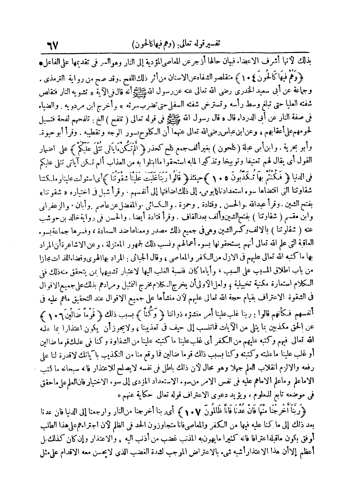 - متقلصو الشفاه عن الأسنان من أثر ذلك اللفح وقد صح من رواية الترمذي وجماعة عن أبي سعيد الخدري رضي الله تعالى عنه عن رسول الله صلى الله عليه و سلم أنه قال في الآية تشويه النار فتقلص شفته العليا حتى تبلغ وسط رأسه وتسترخي شفته السفلى حتى تضرب سرته وأخرج ابن مردويه والضياء في صفة النار عن أبي الدرداء قال قال رسول الله صلى الله عليه و سلم في قوله تعالى تلفح الخ : تلفحهم لفحة فتسيل لحومهم على أعقابهم وعن ابن عباس رضي الله تعالى عنهما أن الكلوح بسور الوجه وتقطيبه وقرأ أبو حيوة وأبو بحرية وابن أبي عبلة كلحون بغير ألف جمع كلح كحذر ألم تكن آياتي تتلى عليكم على إضمار القول أي يقال لهم تعنيفا وتوبيخا وتذكيرا لما به استحقوا ما ابتلوا به من العذاب ألم تكن آياتي تتلى عليكم في الدنيا فكنتم بها تكذبون