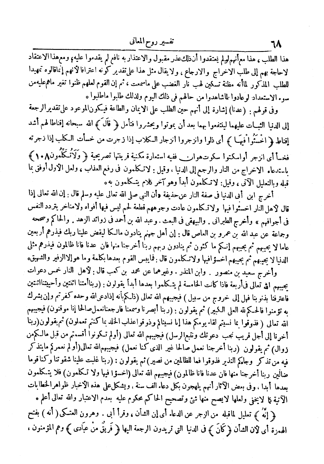 - باستدعاء الإخراج من النار والرجع إلى الدنيا وقيل : لا تكلمون في رفع العذاب ولعل الأول أوفق بما قبله بالتعليل الآتي وقيل : لا تكلمون أبدا وهو آخر كلام يتكلمون به
