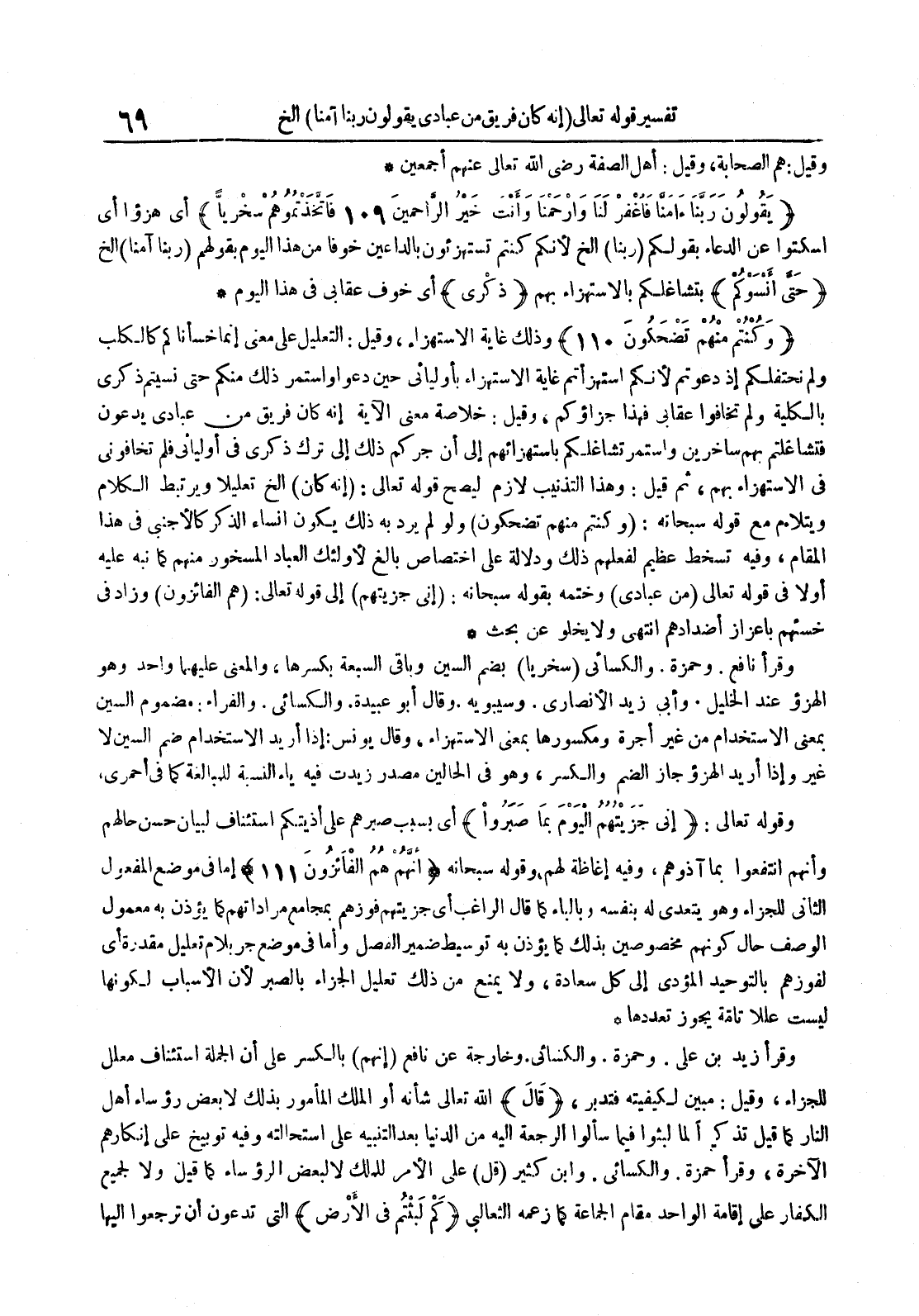 وقرأ نافع وحمزة والكسائي سخريا بضم السين وباقي السبعة بكسرها والمعنى عليهما واحد وهو الهزؤ عند الخليل وأبي زيد الأنصاري وسيبويه وقال أبو عبيدة والكسائي والفراء : مضموم السين بمعنى الإستخدام من غير أجرة ومكسورها بمعنى الإستهزاء وقال يونس : إذا أريد الإستخدام ضم السين لا غير وإذا أريد الهزؤ جاز الضم والكسر وهو في الحالين مصدر زيدت فيه ياء النسبة للمبالغة كما في أحمري وقوله تعالى : إني جزيتهم اليوم بما صبروا أي بسبب صبرهم على أذيتكم استئناف لبيان حسن حالهم وأنهم انتفعوا بما آذوهم وفيه إغاظة لهم وقوله سبحانه إنهم هم الفائزون