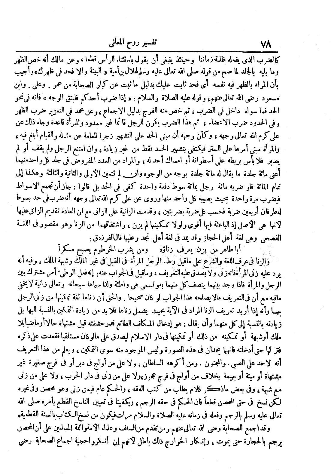 كالضرب الذي يفعله ظلمة زماننا وحينئذ ينبغي أن يقول باستثناء الرأس قطعا وعن مالك أنه خص الظهر وما يليه بالجلد لما صح من قوله صلى الله تعالى عليه وسلم لهلال ابن أمية البينة وإلا فحد في ظهرك وأجيب بأن المراد بالظهر فيه نفسه أي فحد ثابت عليك بدليل ما ثبت عن كبار الصحابة من عمر وعلي وابن مسعود رضي الله تعالى عنهم وقوله عليه الصلاة و السلام : إذا ضرب أحدكم فليتق الوجه فإنه في نحو الحد فما سواه داخل في الضرب ثم خص منه الفرج بدليل الإجماع وعن محمد في التعزير ضرب الظهر وفي الحدود ضرب الأعضاء ثم هذا الضرب يكون للرجل قائما غير ممدود وللمرأة قاعدة وجاء ذلك عن علي كرم الله تعالى وجهه وكأن وجهه أن مبني الحد على التشهير زجرا للعامة على مثله والقيام أبلغ فيه والمرأة مبني أمرها على الستر فيكتفي بتشهير الحد فقط من غير زيادة وإن امتنع الرجل ولم يقف أو لم يصبر فلا بأس بربطه على اسطوانة أو إمساك أحد له والمراد من العدد المفروض في جلد كل واحد منهما أعني مائة جلدة ما يقال له مائة جلدة بوجه من الوجوه وإن لم تتعين الأولى والثانية والثالثة وهكذا إلى تمام المائة فلو ضربه مائة رجل بمائة سوط دفعة واحدة كفى في الحد بل قالوا : جاز أن تجمع الأسواط فيضرب مرة واحدة بحيث يصيبه كل واحد منها وروي عن علي كرم الله تعالى وجهه أنه ضرب في حد بسوط له طرفان أربعين ضربة فحسب كل ضربة بضربتين وقدمت الزانية على الزاني مع أن العادة تقديم الزاني عليها لأنها هي الأصل إذ الباعثة فيها أقوى ولولا تمكينها لم يزن واشتقاقهما من الزنا وهو مقصور في اللغة الفصحى وهي لغة أهل الحجاز وقد يمد في لغة أهل نجد وعليها قال الفرزدق : أبا طاهر من يزن يعرف زناؤه ومن يشرب الخرطوم يصبح مسكرا والزنا في عرف اللغة والشرع على ما قيل وطء الرجل المرأة في القبل في غير الملك وشبهة الملك وفيه أنه يرد عليه زنى المرأة فإنه زنى ولا يصدق عليه التعريف وما قيل في الجواب عنه : إنه فعل الوطيء أمر مشترك بين الرجل والمرأة فإذا وجد بينهما يتصف كل منهما به وتسمى هي واطئة ولذا سماها سبحانه وتعالى زانية لا يخفى ما فيه مع أن في التعريف ما لا يصلحه هذا الجواب لو كان صحيحا والحق أن زناها لغة تمكينها من زنى الرجل بها وأنه إذا أريد تعريف الزنا المراد في الآية بحيث يشمل زناها فلا بد من زيادة التمكين بالنسبة إليها بل زيادته بالنسبة إلى كل منهما وأن يقال : هو إدخال المكلف الطائع قدر حشفته قبل مشتهاة حالا أو ماضيا بلا ملك أو شبهة أو تمكينه من ذلك أو تمكينها في دار الإسلام ليصدق على ما لو كان مستلقيا فقعدت على ذكره فتركها حتى أدخلته فإنهما يحدان في هذه الصورة وليس الموجود منه سوى التمكين ويعلم من هذا التعريف أنه لا حد على الصبي والمجنون ومن أكرهه السلطان ولا على من أولج في دبر أو في فرج صغيرة غير مشتهاة أو ميتة أو بهيمة بخلاف من أولج في فرج عجوز ولا على من زنى في دار الحرب ولا على من زنى مع شبهة وفي بعض ما ذكر كلام يطلب من كتب الفقه والحكم عام فيمن زنى وهو محصن وفي غيره لكن نسخ في حق المحصن قطعا فإن الحكم في حقه الرجم ويكفينا في تعيين الناسخ القاطع بأمره صلى الله تعالى عليه وسلم بالرجم وفعله في زمانه عليه الصلاة و السلام مرات فيكون من نسخ الكتاب بالسنة القطعية