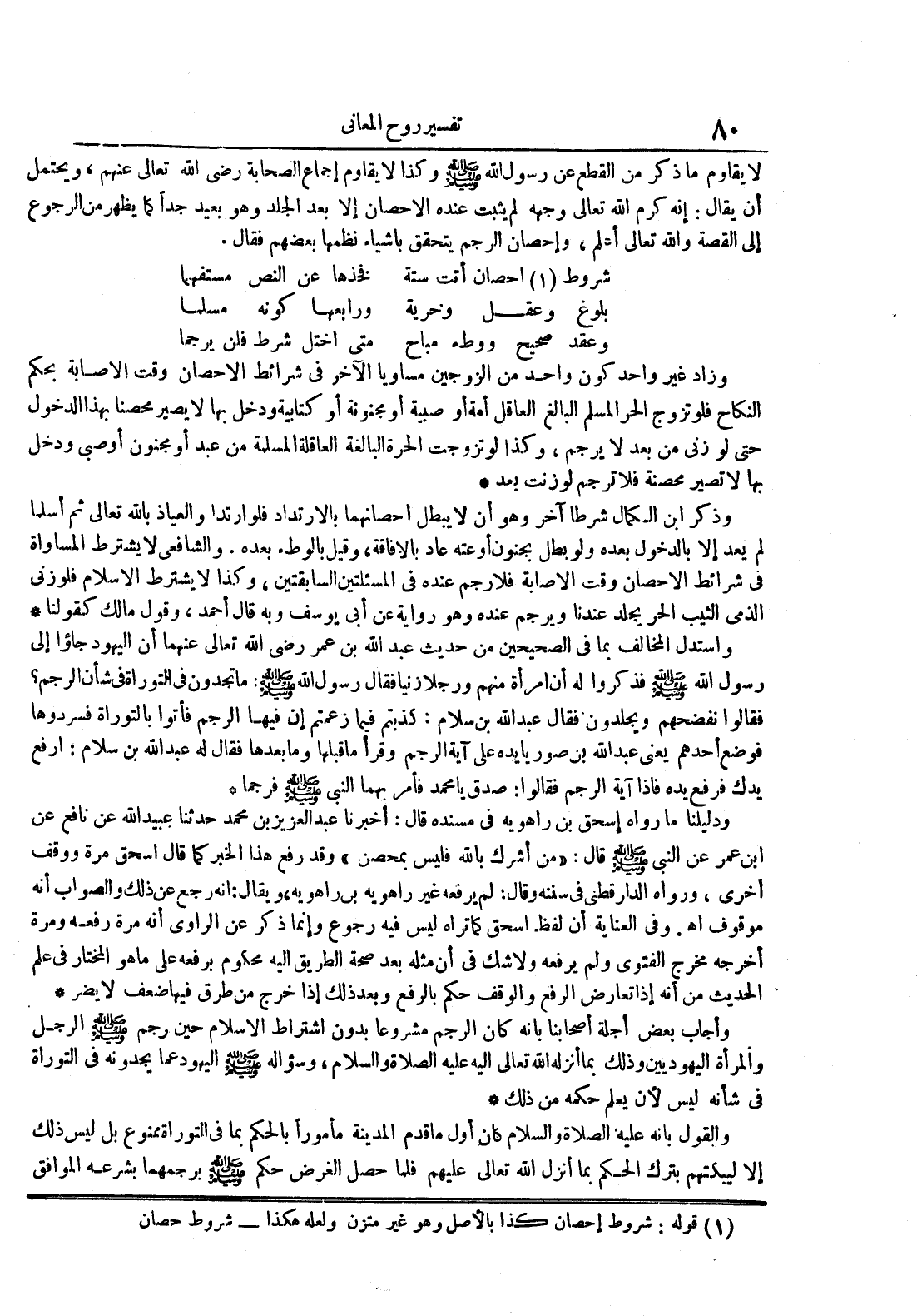 وأجاب بعض أجلة أصحابنا بأنه كان الرجم مشروعا بدون اشتراط الإسلام حين رجم صلى الله عليه و سلم الرجل والمرأة اليهوديين وذلك بما أنزله الله تعالى إليه عليه الصلاة و السلام وسؤاله صلى الله عليه و سلم اليهود عما يجدونه في التوراة في شأنه ليس لأن يعلم حكمه من ذلك