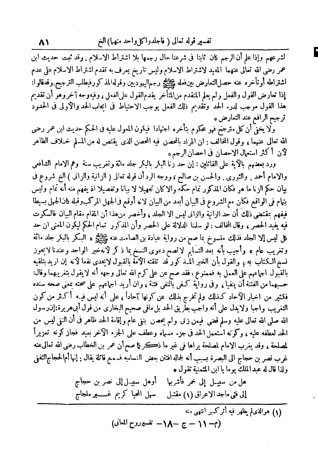 ورد بعضهم بالآية على القائلين : إن حد زنا البكر بالبكر جلد مائة وتغريب سنة وهم الإمام الشافعي والإمام أحمد والثورى والحسن بن صالح ووجه الرد أن قوله تعالى الزانية والزاني الخ شروع في بيان حكم الزنا ما هو فكان المذكور تمام حكمه زإلا كان تجهيلا لا بيانا وتفصيلا إذ يفهم منه أنه تمام وليس بتمام في الواقع فكان مع الشروع في البيان أبعد من البيان لأنه أوقع في الجهل المركب وقبله كان الجهل بسيطا فيفهم بمقتضى ذلك أن حد الزانية والزاني ليس إلا الجلد وأخصر من هذا أن المقام مقام البيان فالسكوت فيه يفيد الحصر وقال المخالف : لو سلما الدلالة على الحصر وأن المذكور تمام الحكم ليكون المعنى إن حد كل ليس إلا الجلد فذلك منسوخ بما صح من رواية عبادة بن الصامت عنه صلى الله عليه و سلم البكر بالبكر جلد مائة وتغريب عام وأجيب بأنه بعد التسليم لا تصح دعوى النسخ بما ذكر لأنه خبر الواحد وعندنا لا يجوز نسخ الكتاب به والقول بأن الخبر المذكور قد تلقته الأمة بالقبول لا يجدي نفعا لأنه إن أريد بتلقيه بالقبول إجماعهم على العمل به فممنوع فقد صح عن علي كرم الله تعالى وجهه أنه لا يقوم بتغريبهما وقال : حسبهما من الفتنة أن ينفيا وفي رواية كفى بالنفي فتنة وإن أريد إجماعهم على صحته بمعنى صحه سنده فكثير من أخبار الآحاد كذلك ولم تخرج بذلك عن كونها آحادا على أنه ليس فيه أكثر من كون التغريب واجبا ولا يدل على أنه واجب الحد بل ما في صحيح البخاري من قول أبي هريرة : أن رسول الله صلى الله تعالى عليه وسلم قضى فيمن زنى ولم يحصن بنفي عام وإقامة الحد ظاهر في أن النفي ليس من الحد لعظمه عليه وكونه استعمل الحد في جزء مسماه وعطف على الجزء الآخر بعيد فجاز كونه تعزيرا لمصلحة وقد يغرب الإمام لمصلحة يراها في غير ما ذكر كما صح أن عمر بن الخطاب رضي الله تعالى عنه غرب نصر بن حجاج إلى البصرة بسبب أنه لجماله افتتن بعض النساء به فسمع قائلة يقال : إنها أم الحجاج الثقفي ولذا قال له عبد الملك يوما يا ابن المتمنية تقول