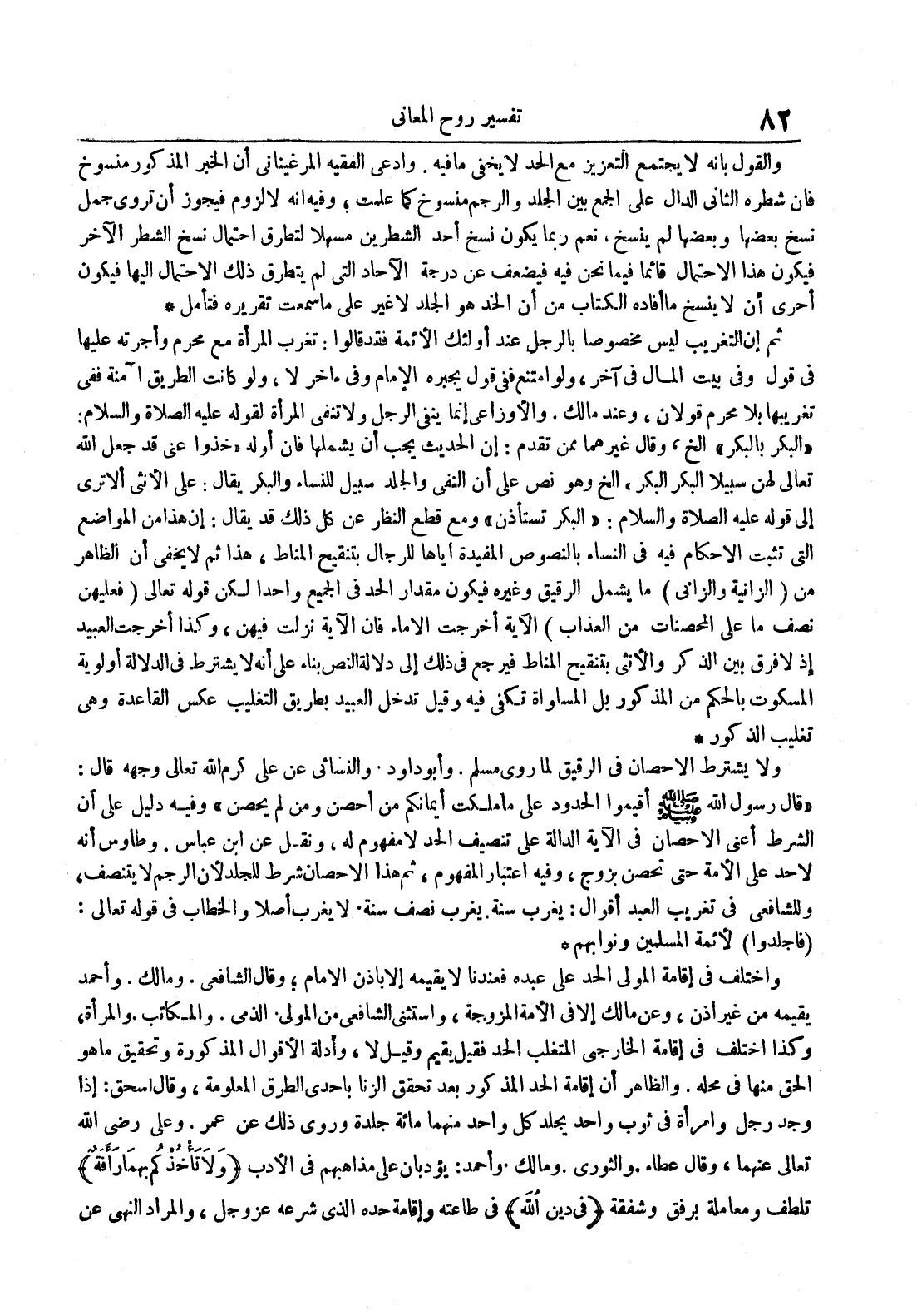 واختلف في إقامة المولى الحد على عبده فعندنا لا يقيمه إلا بإذن الإمام وقال الشافعي ومالك وأحمد يقيمه من غير إذن وعن مالك إلا في الأمة المزوجة واستثنى الشافعي في المولى الذمي والمكاتب والمرأة وكذا اختلف في إقامة الخارجي المتغلب الحد فقيل يقيم وقيل لا وأدلة الأقوال المذكورة وتحقيق ما هو الحق منها محله والظاهر أن إقامة الحد المذكور بعد تحقق الزنا بإحدى الطرق المعلومة وقال إسحاق : إذا وجد رجل وامرأة في ثوب واحد يجلد كل منهما مائة جلدة وروي ذلك عن عمر وعلي رضي الله تعالى عنهما وقال عطاء والثوري ومالك وأحمد : يؤدبان على مذاهبهم في الأدب ولا تأخذكم بهما رأفة تلطف ومعاملة برفق وشفقة في دين الله في طاعته وإقامته حده الذي شرعه عز و جل والمراد النهي عن