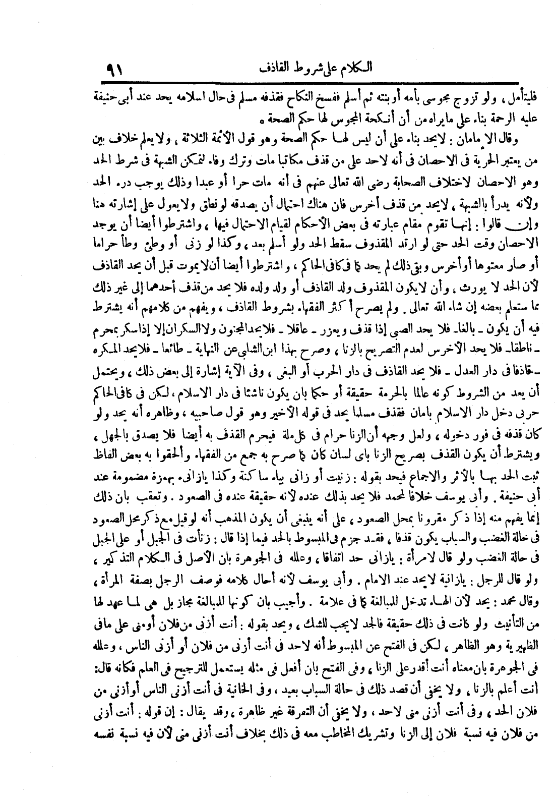 وقال الإمامان : لا يحد بناء على أن ليس لها حكم الصحة وهو قول الأئمة الثلاثة ولا يعلم خلاف بين من يعتبر الحرية في الإحصان في أنه لا حد على من قذف مكاتبا مات وترك وفاء لتمكن الشبهة في شرط الحد وهو الإحصان لاختلاف الصحابة رضي الله تعالى عنهم في أنه مات حرا أو عبدا وذلك يوجب درء الحد ولأنه يدرأ بالشبهة لا يحد من قذف أخرس فإن هناك احتمال أن يصدقه لو نطق ولا يعول على إشارته هنا وإن قالوا : إنها تقوم مقام عبارته في بعض الأحكام لقيام الإحتمال فيها واشترطوا أيضا أن يوجد الإحصان وقت الحد حتى لو ارتد المقذوف سقط الحد ولو أسلم بعد وكذا لو زنى أو وطيء وطأ حراما أو صار معتوها أو أخرس وبقي ذلك لم يحد كما في كافي الحاكم واشترطوا أيضا أن لا يموت قبل أن يحد القاذف لأن الحد لا يورث وأن لا يكون المقذوف ولد القاذف أو ولد ولده فلا يحد من قذف أحدهما إلى غير ذلك مما ستعلم بعضه إن شاء الله تعالى ولم يصرح أكثر الفقهاء بشروط القاذف ويفهم من كلامهم أنه يشترط فيه أن يكون بالغا فلا يحد الصبي إذا قذف ويعزر عاقلا فلا يحد المجنون ولا السكران إلا غذا سكر بمحرم ناطقا فلا يحد الأخرس لعدم التصريح بالزنا وصرح بهذا ابن الشلبي عن النهاية طائعا فلا يحد المكره قاذفا في دار العدل فلا يحد القاذف في دار الحرب أو البغي وفي الآية إشارة إلى بعض ذلك ويحتمل أن يعد من الشروط كونه عالما بالحرمة حقيقة أو حكما بأن يكون ناشئا في دار الإسلام لكن في كافي الحاكم حربي دخل دار الإسلام بأمان فقذف مسلما يحد في قوله الأخير وهو قول صاحبيه وظاهره أنه يحد ولو كان قذفه في فور دخوله ولعل وجهه أن الزنا حرام في كل ملة فيحرم القذف به أيضا فلا يصدق بالجهل ويشترط أن يكون القذف بصريح الزنا بأي لسان كان كما صرح به جمع من الفقهاء وألحقوا به بعض ألفاظ ثبت الحد بها بالأثر والإجماع فيحد بقوله : زنيت أو زاني بياء ساكنة وكذا يا زاني بهمزة مضمومة عند أبي حنيفة وأبي يوسف خلافا لمحمد فلا يحد بذلك عنده لأنه حقيقة عنده في الصعود وتعقب بأن ذلك إنما يفهم منه إذا ذكر مقرونا بمحل الصعود على أنه ينبغي أن يكون المذهب أنه لو قيل مع ذكر محل الصعود في حالة الغضب والسباب يكون قذفا فقد جزم في المبسوط بالحد فيما إذا قال : زنأت في الجبل أو على الجبل في حالة الغضب ولو قال لامرأة : يا زاني حد اتفاقا وعلله في الجوهرة بأن الأصل في الكلام التذكير ولو قال للرجل : يا زانية لا يحد عند الإمام وأبي يوسف لأنه أحال كلامه فوصف الرجل بصفة المرأة وقال محمد : يحد لأن الهاء تدخل للمبالغة كما في علامة وأجيب بأن كونها للمبالغة مجاز بل هي لما عهد لها من التأنيث ولو كانت في ذلك حقيقة فالحد لا يجب للشك ويحد بقوله : أنت أزنى من فلان أو مني على ما في الظهيرية وهو الظاهر لكن في الفتح عن المبسوط أنه لا حد في أنت أزنى من فلان أو أزنى الناس وعلله في الجوهرة بأن معناه أنت أقدر على الزنا وفي الفتح بأن أفعل في مثله يستعمل للترجيح في العلم فكأنه قال : أنت أعلم بالزنا ولا يخفى أن قصد ذلك في حالة السباب بعيد وفي الخانية في أنت أزنى الناس أو أزنى من فلان الحد وفي أنت أزنى مني لا حد ولا يخفى أن التعرقة غير ظاهرة وقد يقال : إن قوله : أنت أزنى من فلان فيه نسبة فلان إلى الزنا وتشريك المخاطب معه في ذلك بخلاف أنت أزنى مني لأن فيه نسبة نفسه