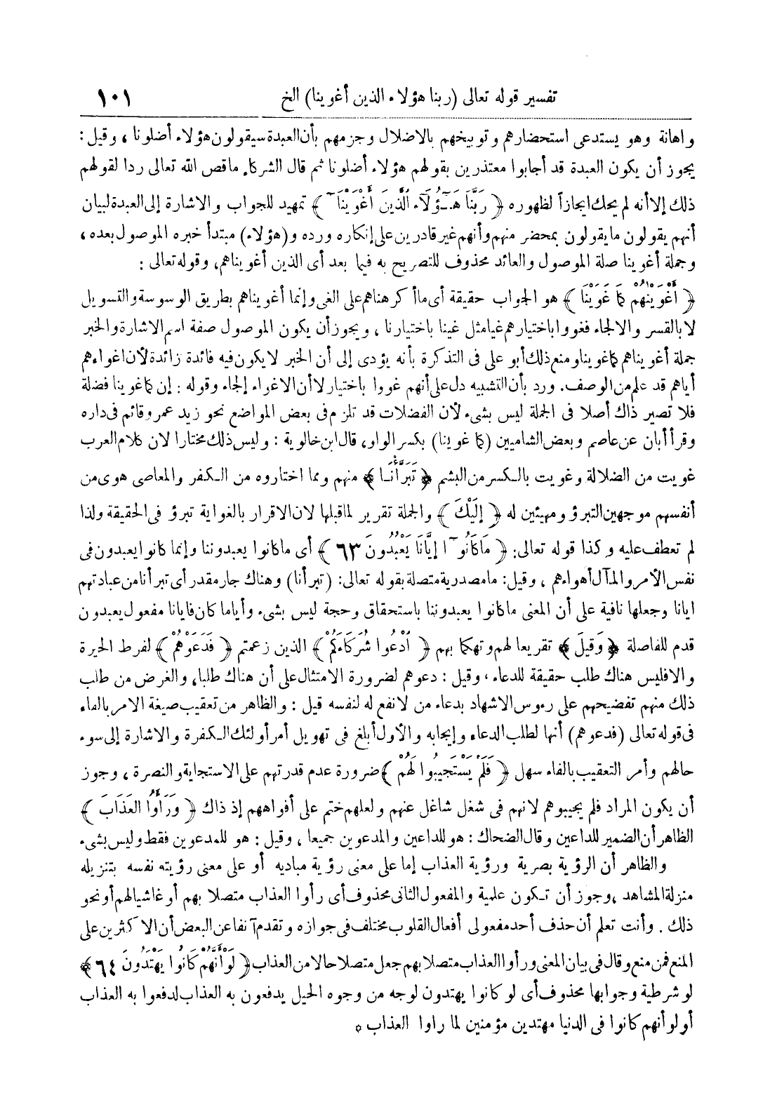 واهانة وهو يستدعي استحضارهم وتوبيخهم بالاضلال وجزمهم بأن العبدة سيقولون هؤلاء أضلونا وقيل : يجوز أن يكون العبدة قد أجابوا معتذرين بقولهم هؤلاء أضلونا ثم قال الشركاء ما قص الله تعالى ردا لقولهم ذلك إلا أنه لم يحك إيجازا لظهوره ربنا هؤلاء الذين أغوينا تمهيد للجواب والاشارة إلى العبدة لبيان أنهم يقولون ما يقولون بمحضر منهم وأنهم غير قادرين على إنكاره ورده و هؤلاء مبتدأ خبره الموصول بعده وجملة أغوينا صلة الموصول والعائد محذوف للتصريح به فيما بعد أي الذين أغويناهم وقوله تعالى : أغويناهم كما غوينا هو الجواب حقيقة أي ما أكرهناهم على الغي وإنما أغويناهم بطريق الوسوسة والتسويل لا بالقسر والالجاء فغووا باختيارهم غيا مثل غينا باختيارنا ويجوز أن يكون الموصول اسم الاشارة والخبر جملة أغويناهم كما غوينا ومنه ذلك أبو علي في التذكرة بأنه يؤدي إلى أن الخبر لا يكون فيه فائدة زائدة لأن إغواءهم إياهم قد علم من الوصف ورد بأن التشبيه دل على أنهم غووا باختيار لأن أن الاغواء إلجاء وقوله : إن كما غوينا فضلة فلا تصير ذاك أصلا في الجملة ليس بشيء لأن الفضلات قد تلزم في بعض المواضع نحو زيد عمرو قائم في داره وقرأ أبان عن عاصم وبعض الشاميين كما غوينا بكسر الواو قال ابن خالويه : وليس ذلك مختارا لأن كلام العرب غويت من الضلالة وغويت بالكسر من البشم تبرأنا منهم ومما اختاروه من الكفر والمعاصي هوى من أنفسهم موجهين التبرؤ ومهيئين له إليك والجملة تقرير لما قبلها لأن الاقرار بالغواية تبرؤ في الحقيقة ولذا لم تعطف عليه وكذا قوله تعالى : ما كانوا إيانا يعبدون