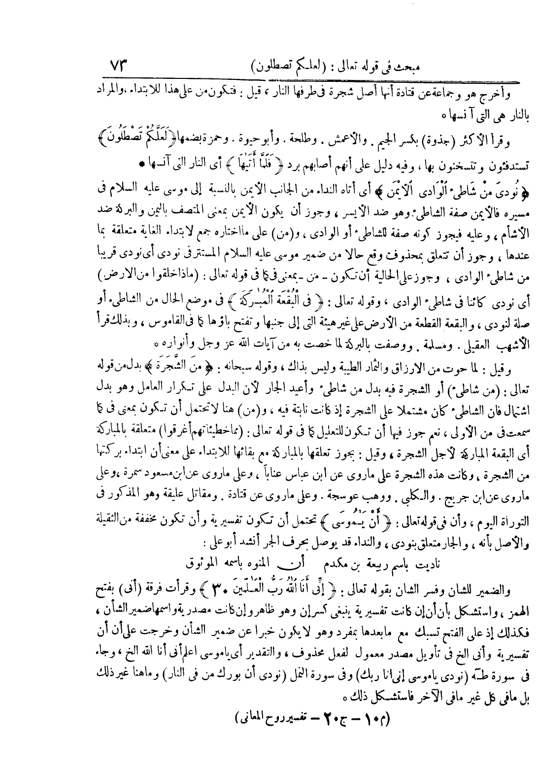 - وقرأت فرقة أني بفتح الهمز واستشكل بأن أن إن كانت تفسيرية ينبغي كسر إن وهو ظاهر وإن كانت مصدرية واسمها ضمير الشأن فكذلك إذ على الفتح تسبك مع ما بعدها بمفرد وهو لايكون خبرا عن ضمير الشأن وخرجت على أن أن تفسيرية وأني الخ في تأويل مصدر معمول لفعل محذوف والتقدير أي ياموسى أعلم أني أنا الله الخ وجاء في سورة طه نودي يا موسى إني أنا ربك وفي سورة النمل نودي أن بورك من في النار وما هنا غير ذلك بل ما في كل غير ما في الآخر فاستشكل ذلك
