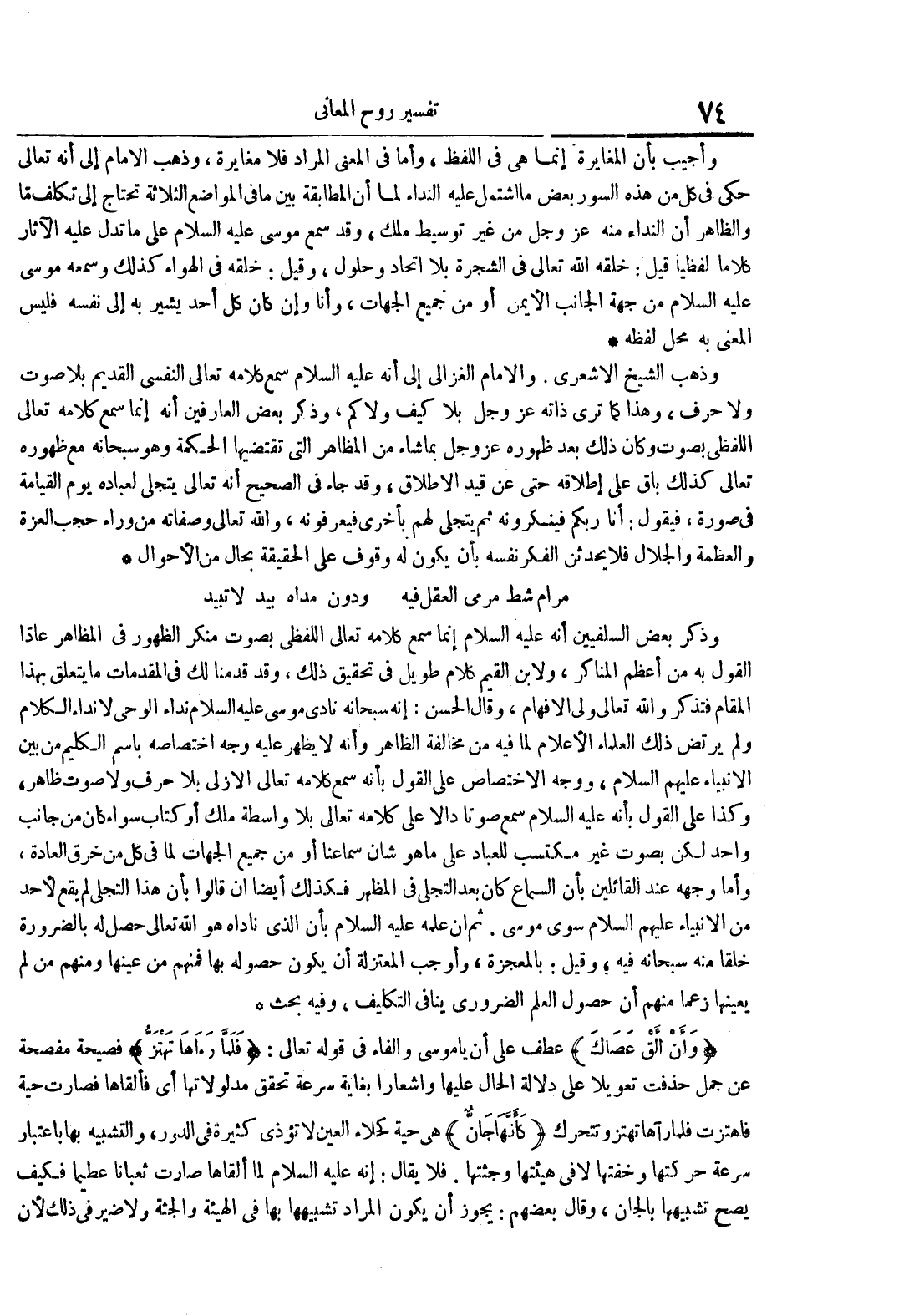 وذهب الشيخ الاشعري والامام الغزالي إلى أنه عليه السلام سمع كلامه تعالى النفسي القديم بلا صوت ولا حرف وهذا كما ترى ذاته عز و جل بلا كيف ولا كم وذكر بعض العارفين أنه إنما سمع كلامه تعالى اللفظي بصوت وكان ذلك بعد ظهوره عز و جل بما شاء من المظاهر التي تقتضيها الحكمة وهو سبحانه مع ظهوره تعالى كذلك باق على إطلاقه حتى عن قيد الاطلاق وقد جاء في الصحيح أنه تعالى يتجلى لعباده يوم القيامة في صورة فيقول : أنا ربكم فينكرونه ثم يتجلى لهم بأخرى فيعرفونه والله تعالى وصفاته من وراء حجب العزة والعظمة والجلال فلا يحدثن الفكر نفسه بأن يكون له وقوف على الحقيقة بحال من الأحوال