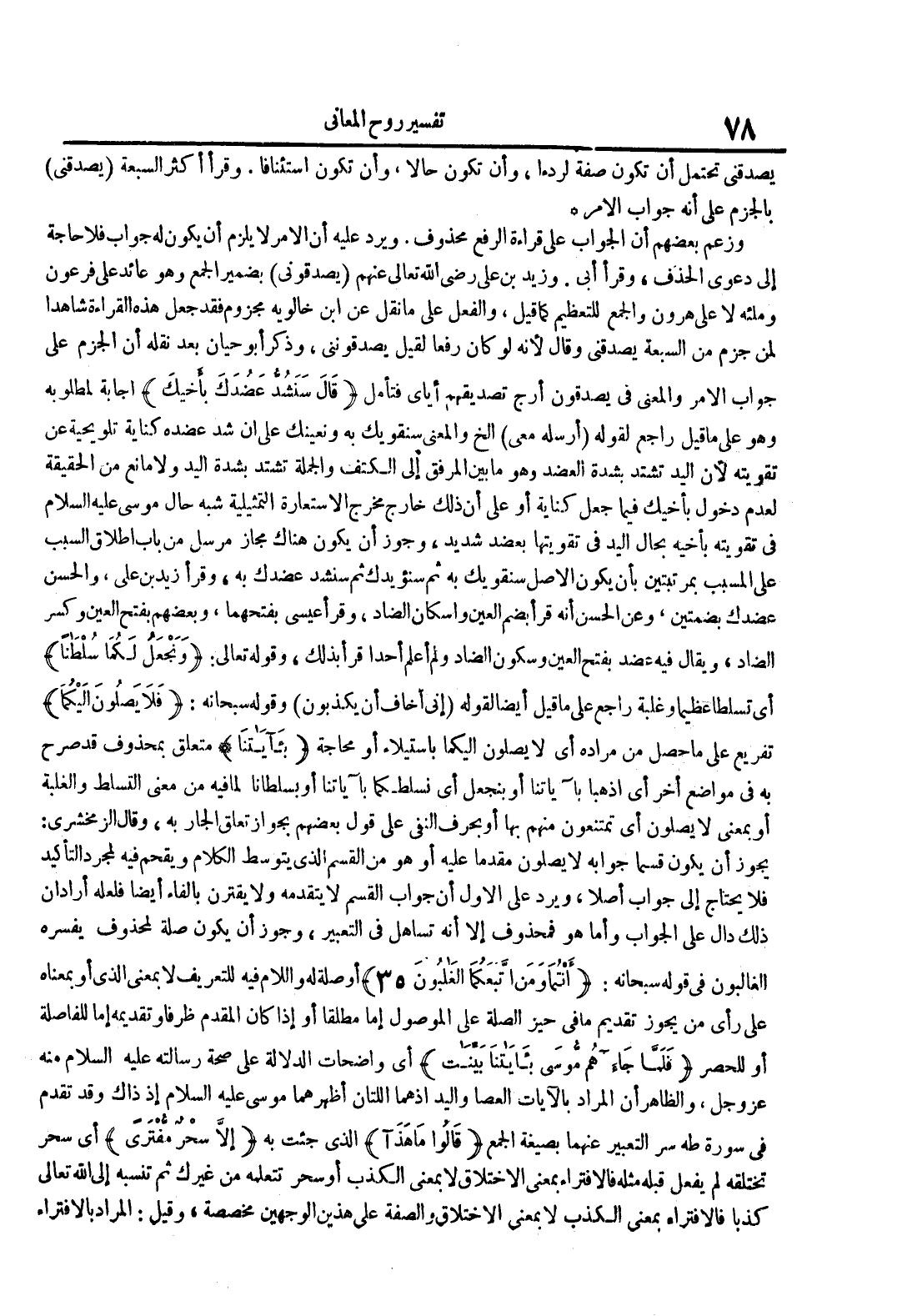 وزعم بعضهم ان الجواب على قراءة الرفع محذوف ويرد عليه أن الأمر لا يلزم أن يكون له جواب فلا حاجة إلى دعوى الحذف وقرأ أبي وزيد بن علي رضي الله تعالى عنهم يصدقني بضمير الجمع وهو عائد على فرعون وملئه لا على هرون والجمع للتعظيم كما قيل والفعل على ما نقل عن أبن خالويه مجزوم فقد جعل هذه القراءة شاهدا لمن جزم من السبعة يصدقني وقال لأنه لو كان رفعا لقيل يصدقونني وذكر أبو حيان أن الجزم على جواب الأمر والمعني في يصدقون أرج تصديقهم أياي فتأمل قال سنشد عضدك بأخيك اجابة لمطلوبه وهو على ما قيل راجع لقوله أرسله معي الخ والمعنى سنقويك به ونعينك على أن شد عضده كناية تلويحية عن تقويته لأن اليد تشتد بشدة العضد وهو ما بين المرفق إلى الكتف والجملة تشتد بشدة اليد ولا مانع من الحقيقة لعدم دخول بأخيك فيما جعل كناية أو على أن ذلك خارج مخرج الاستعارة التمثيلية شبه حال موسى عليه السلام في تقويته بأخيه بحال اليد في تقويتها بعضد شديد وجوز أن يكون هناك مجاز مرسل من باب اطلاق السبب على المسبب بمرتبتين بأن يكون الاصل سنقويك به ثم سنؤيدك ثم سنشد عضدك به وقرأ زيد بن علي والحسن عضدك بضمتين وعن الحسن أنه قرأ بضم العين واسكان الضاد وقرأ عيسى بفتحهما وبعضهم بفتح العين وكسر الضاد ويقال فيه عضد بفتح العين وسكون الضاد ولم أعلم أحدا قرأ بذلك وقوله تعالى : ونجعل لكما سلطانا أي تسلطا عظيما وغلبة راجع على ما قيل أيضا لقوله إني أخاف أن يكذبون وقوله سبحانه : فلا يصلون اليكما تفريع على ما حصل من مراده أي لا يصلون اليكما باستيلاء أو محاجة بأياتنا متعلق بمحذوف قد صرح به في مواضع أخرى أي إذهبا بآياتنا أو بنجعل أي نسلطكما بآياتنا أو بسلطانا لما فيه من معنى التسلط والغلبة أو بمعنى لا يصلون أي تمتنعون منهم بها أو بحرف النفي على قول بعضهم بجواز تعلق الجار به وقال الزمخشري : يجوز أن يكون قسما جوابه لا يصلون مقدما عليه أو هو من القسم الذي يتوسط الكلام ويقحم فيه لمجرد التاكيد فلا يحتاج إلى جواب أصلا ويرد على الاول أن جواب القسم لا يتقدمه ولا يقترن بالفاء أيضا فلعله أراد أن ذلك دال على الجواب وأما هو فمحذوف إلا أنه تساهل في التعبير وجوز أن يكون صلة لمحذوف يفسره الغالبون في قوله سبحانه : أنتما ومن اتبعكما الغالبون