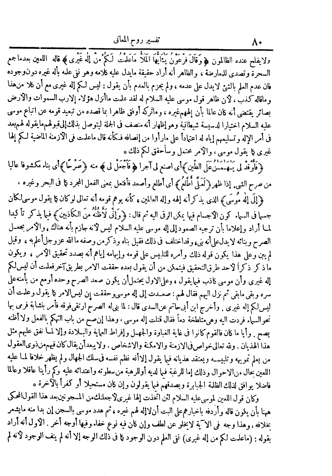 ولاولا يفلح عنده الظالمون وقال فرعون يا أيها الملأ ما علمت لكم من إله غيري قاله اللعين بعدما جمع السحرة وتصدى للمعارضة والظاهر أنه أراد حقيقة ما يدل عليه كلامه وهو نفي علمه باله غيره دون وجوده فان عدم العلم بالشيء لا يدل على عدمه ولم يجزم بالعدم بأن يقول : ليس لكم إله غيري مع أن كلا من هذا وما قاله كذب لأن ظاهر قول موسى عليه السلام له لقد علمت ما أنزل هؤلاء إلا رب السموات والأرض بصائر يقتضي أنه كان عالما بأن إلههم غيره وما تركه أوفق ظاهرا بما قصده من تبعيد قومه عن اتباع موسى عليه السلام اختيارا لدسيسة شيطانية وهو إظهار أنه منصف في الجملة ليتوصل بذلك إلى قبولهم ما يقوله لهم بعد في امر الإله وتسليمهم إياه له اعتمادا على ما رأوا من إنصافه فكأنه قال ما علمت في الأزمنة الماضية لكم إلها غيري كما يقول موسى والأمر محتمل وسأحقق لكم ذلك