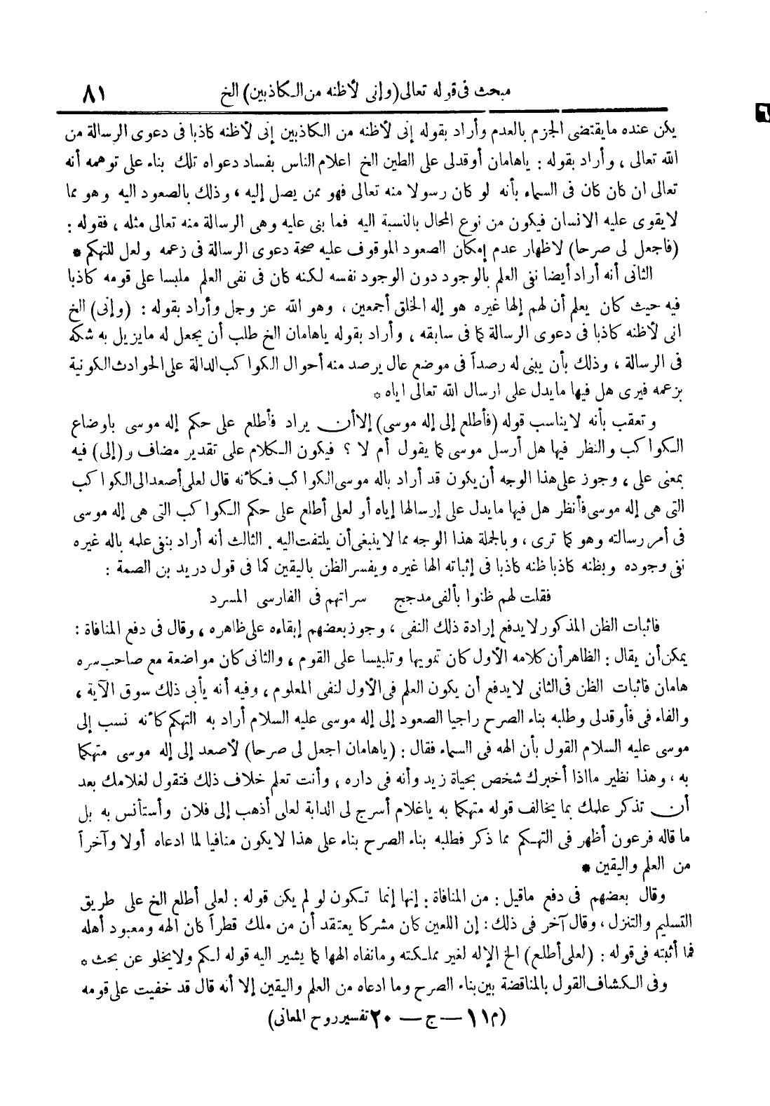 الثاني أنه اراد أيضا نفي العلم بالوجود دون الوجود نفسه لكنه كان في نفي العلم ملبسا على قومه كاذبا فيه حيث كان يعلم أن لهم إلها غيره هو إله الخلق أجمعين وهو الله عز و جل وأراد بقوله : وإني الخ اني لأظنه كاذبا في دعوى الرسالة كما في سابقه وأراد بقوله يا هامان الخ طلب أن يجعل له ما يزيل به شكه في الرسالة وذلك بأن يبني له رصدا في موضع عال يرصد منه أحوال الكواكب الدالة على الحوادث الكونية بزعمه فيرى هل فيها ما يدل على ارسال الله تعالى إياه