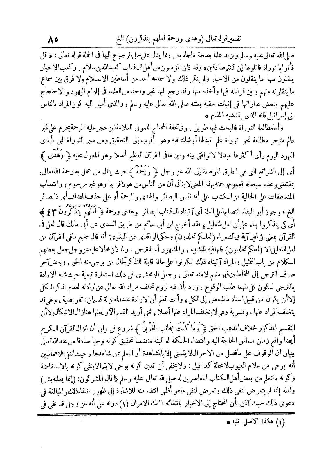وأما مطالعة التوراة فالبحث فيها طويل وفي تحفة المحتاج للمولى العلامة ابن حجر عليه الرحمة يحرم على غير عالم متبحر مطالعة نحو توراة علم تبدلها أو شك فيه وهو أقرب إلى التحقيق ومن سبر التوراة التي بأيدي اليهود اليوم رأى أكثرها مبدلا لا توافق بينه وبين ما في القرآن العظيم أصلا وهو المعول عليه وهدى أي إلى الشرائع التي هي الطرق الموصلة إلى الله عز و جل ورحمة حيث ينال من عمل به رحمة الله تعالى بمقتضى وعده سبحانه فعموم رحمته بهذا المعنى لا ينافي أن من الناس من هو كافر بها وهو غير مرحوم وانتصاب المتعاطفات على الحالية من الكتاب على أنه نفس البصائر والهدى والرحمة أو على حذف المضاف أي ذا بصائر الخ وجوز أبو البقاء انتصابها على العلة أي آتيناه الكتاب لبصائر وهدى ورحمة لعلهم يتذكرون