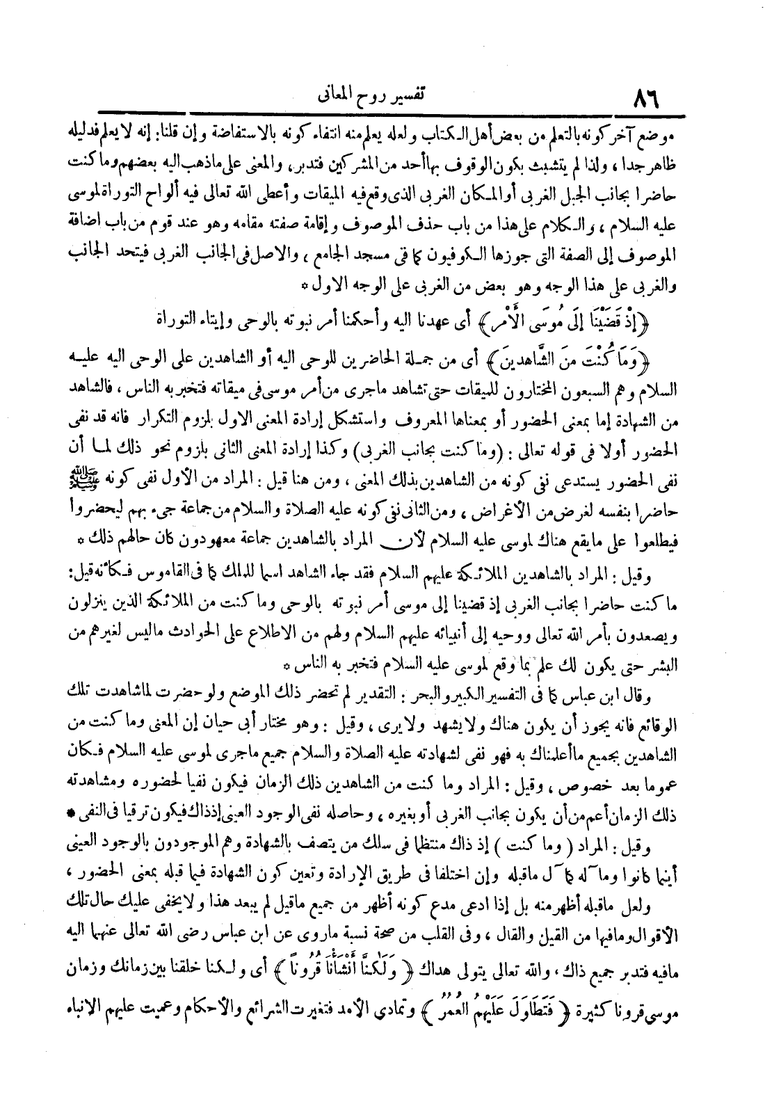 موضعموضع آخر كونه بالتعلم من بعض أهل الكتاب ولعله يعلم منه انتفاء كونه بالاسفاضة وإن قلنا : إنه لا يعلم فدليله ظاهر جدا ولذا لم يتشبث بكون الوقوف بها أحد من المشركين فتدبر والمعنى على ما ذهب اليه بعضهم وما كنت حاضرا بجانب الجبل الغربي او المكان الغربي الذي وقع فيه الميقات واعطى الله تعالى فيه ألواح التوراة لموسى عليه السلام والكلام على هذا من باب حذف الموصوف وإقامة صفته مقامه وهو عند قوم من باب اضافة الموصوف إلى الصفة التي جوزها الكوفيون كما في مسجد الجامع والاصل في الجانب الغربي فيتحد الجانب والغربي على هذا الوجه وهو بعض من الغربي على الوجه الاول