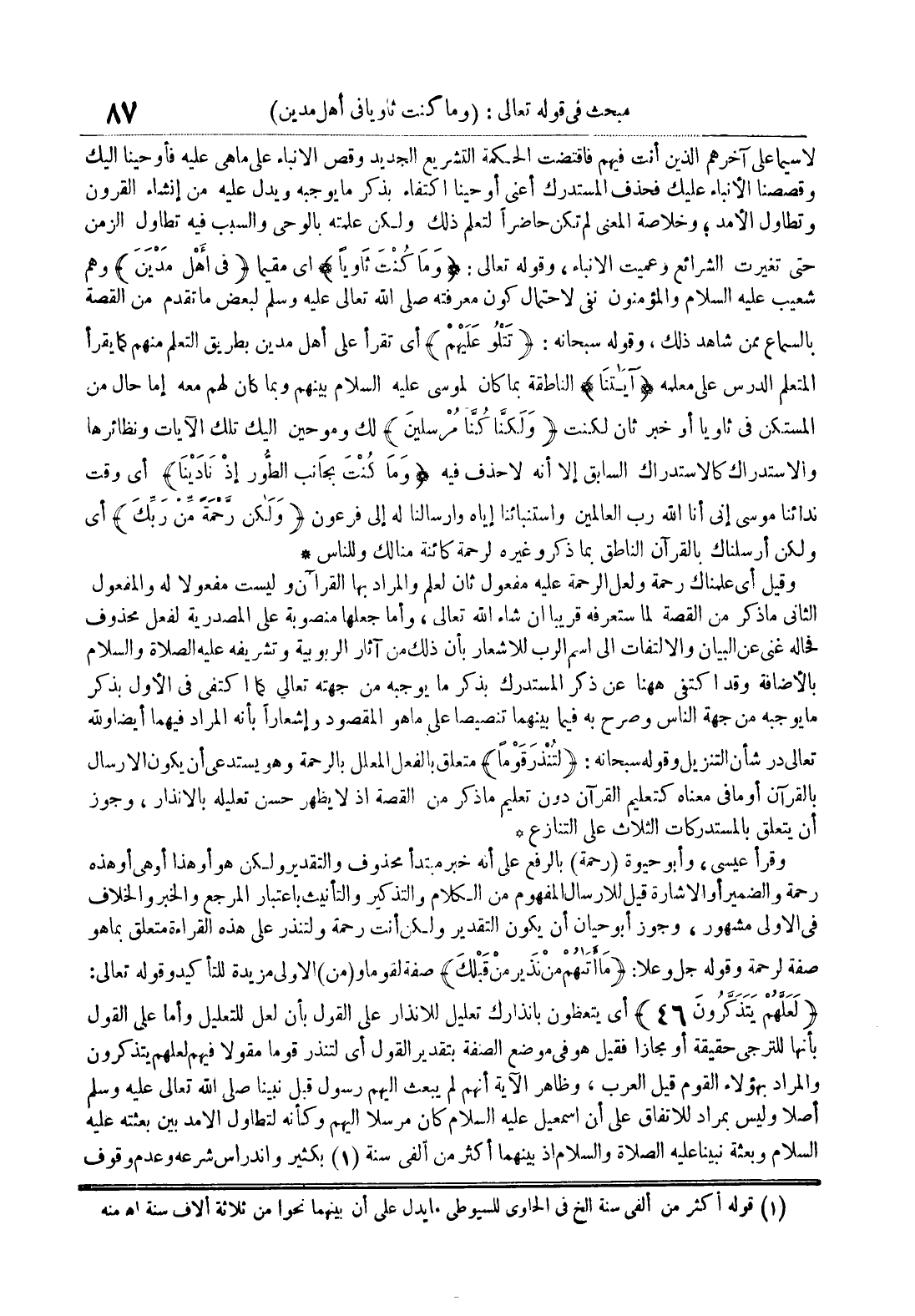 لاسيما على آخرهم الذين أنت فيهم فاقتضت الحكمة التشريع الجديد وقص الانباء على ما هي عليه فأوحينا اليك وقصصنا الانباء عليك فحذف المستدرك أعني أوحينا اكتفاء بذكر ما يوجبه ويدل عليه من إنشاء القرون وتطاول الأمد وخلاصة المعنى لم تكن حاضرا لتعلم ذلك ولكن علمته بالوحي والسبب فيه تطاول الزمن حتى تغيرت الشرائع وعميت الانباء وقوله تعالى : وما كنت ثاويا أي مقيما في أهل مدين وهم شعيب عليه السلام والمؤمنون نفي لاحتمال كون معرفته صلى الله تعالى عليه وسلم لبعض ما تقدم من القصة بالسماع ممن شاهد ذلك وقوله سبحانه تتلو عليهم أي تقرأ على أهل مدين بطريق التعلم منهم كما يقرأ المتعلم الدرس على معلمه آياتنا الناطقة بما كان موسى عليه السلام بينهم وبما كان لهم معه إما حال من المستكن في ثاويا أو خبر ثان لكنت ولكنا كنا مرسلين لك وموحين اليك تلك الآيات ونظائرها والاستدراك كالاستدراك السابق إلا أنه لا حذف فيه وما كنت بجانب الطور إذ نادينا أي وقت ندائنا موسى إني أن الله رب العالمين واستنبائنا إياه وارسالنا له إلى فرعون ولكن رحمة من ربك أي ولكن أرسلناك بالقرآن الناطق بما ذكر وغيره لرحمة كائنة منا لك وللناس