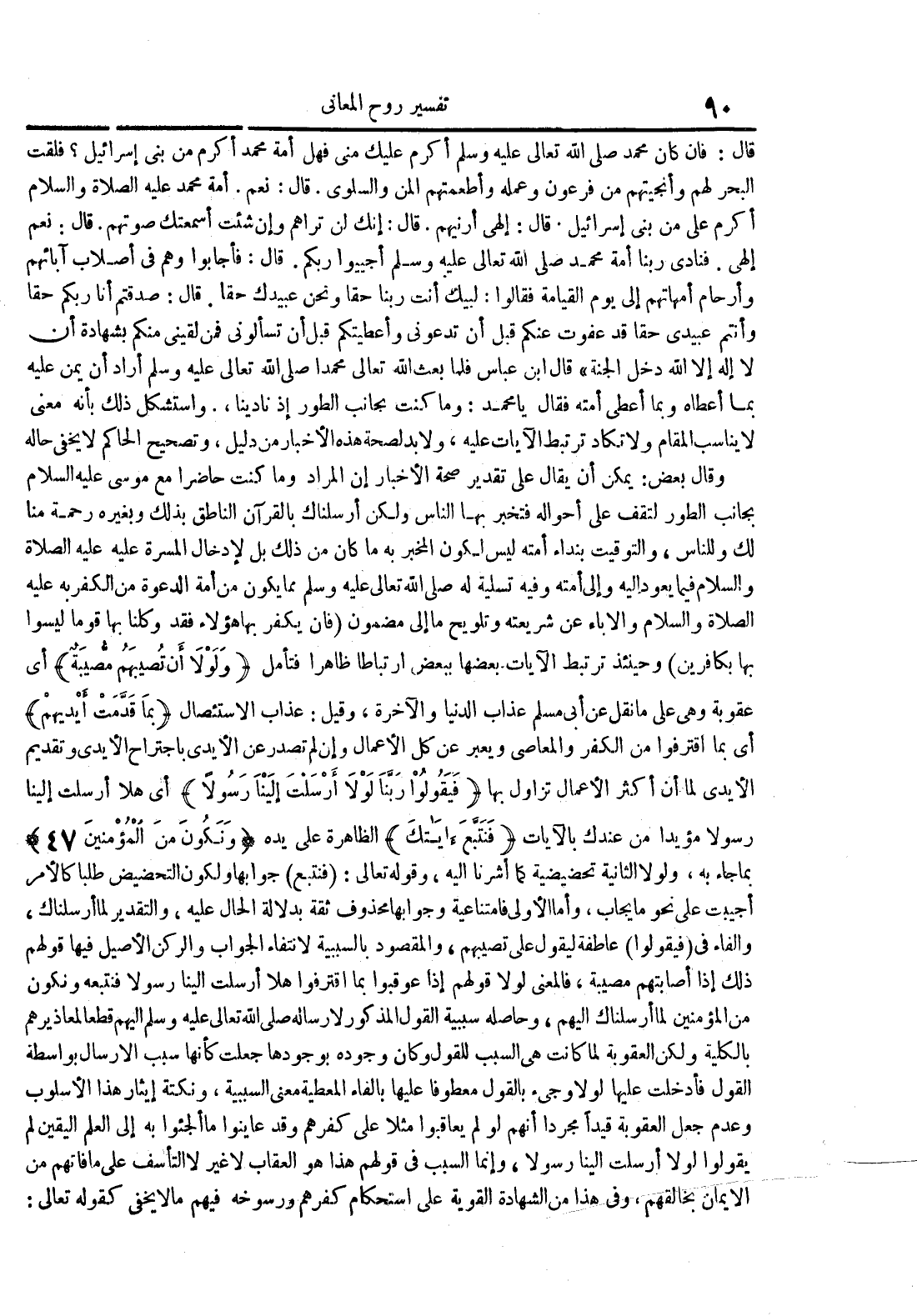 قال : قال : فان كان محمد صلى الله تعالى عليه وسلم أكرم عليك مني فهل أمة محمد أكرم من بني اسرائيل فلقت البحر لهم وأنجيتهم من فرعون وعمله وأظعمتهم المن والسلوى قال : نعم أمة محمد عليه الصلاة و السلام أكرم علي من بني اسرائيل قال إلهي أرنيهم قال : إنك لن تراهم وإن شئت اسمعتك صوتهم قال : نعم إلهي فنادى ربنا أمة محمد صلى الله تعالى عليه وسلم أجيبوا ربكم قال : فأجابو وهم في أصلاب آبائهم وأرحام أمهاتهم إلى يوم القيامة فقالوا : لبيك انت ربنا حقا ونحن عبيدك حقا قال : صدقتم أنا ربكم حقا وأنت عبيدي حقا قد عفوت عنكم قبل أن تدعوني وأعطيتكم قبل أن تسألوني فمن لقيني منكم بشهادة أن لا إله إلا الله دخل الجنة قال ابن عباس فلما بعث الله تعالى محمدا صلى الله تعالى عليه وسلم أراد أن يمن عليه بما أعطاه ومما أعطى أمته فقال يا محمد : وما كنت بجانب الطور إذ نادينا واستشكل ذلك بانه معنى لا يناسب المقام ولا تكاد ترتبط الآيات عليه ولا بد لصحة هذ الأخبار من دليل وتصحيح الحاكم لا يخفى حاله وقال بعض : يمكن أن يقال على تقدير صحة الأخبار إن المراد وما كنت حاضرا مع موسى عليه السلام بجانب الطور لتقف على أحواله فتخبر بها الناس ولكن ارسلناك بالقرآن الناطق بذلك وبغيره رحمة منا لك وللناس والتوقيت بنداء أمته ليس لكون المخبر به ما كان من ذلك بل لإدخال المسرة عليه عليه الصلاة و السلام فيما يعود اليه وإلى أمته وفيه تسلية له صلى الله تعالى عليه وسلم مما يكون من أمة الدعوى من الكفر به عليه الصلاة و السلام والاباء عن شريعته وتلويح ما إلى مضمون فان يكفر بها هؤلاء وكلنا بها قوما ليسوا بها بكافرين وحينئذ ترتبط الآيات بعضها ببعض ارتباطا ظاهر فتأمل ولولا أن تصيبهم مصيبة أي عقوبة وهي على ما نقل عن أبي مسلم عذاب الدنيا والآخرة وقيل : عذاب الاستئصال بما قدمت أيديهم أي بما اقترفوا من الكفر والمعاصي ويعبر عن كل الاعمال وإن لم تصدر عن الايدي باجتراح الايدي وتقديم الأيدي لما أن أكثر الاعمال تزاول بها فيقولوا ربنا لولا أرسلت إلينا رسولا أي هلا أرسلت إلينا رسولا مؤيدا من عندك بالآيات فنتبع ءاياتك الظأهرة على يده ونكون من المؤمنين