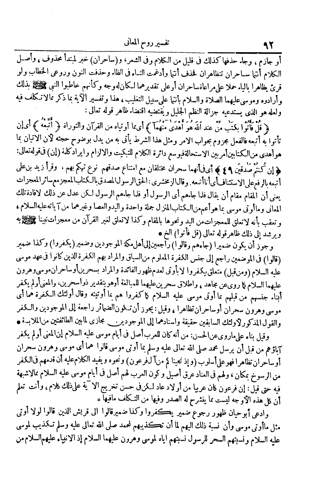 وجوز أن يكون ضمير جاءهم وقالوا راجعين إلى أهل مكة الموجودين وضمير يكفروا وكذا ضمير قالوا في الموضعين راجع إلى جنس الكفرة المعلوم من السياق والمراد بهم الكفرة الذين كانوا في عهد موسى عليه السلام ومن قبل متعلق بيكفروا لا بأوتي لعدم ظهور الفائدة والمراد بسحرين أو ساحران موسى وهرون عليهما السلام كما روى مجاهد واطلاق سحرين عليهما للمبالغة أو هو بتقدير ذو سحرين والمعنى أو لم يكفر أبناء جنسهم من قبلهم بما أوتي موسى عليه السلام كما كفروا هم بما اوتيته وقال اولئك الكفرة هما أي موسى وهرون سحران او ساحران تظاهرا وقيل : يجوز أن تكون الضمائر راجعة إلى الموجودين والكفر والقول المذكور لأولئك السابقين حقيقة واسنادهما إلى الموجودين مجازي لما بين الطائفتين من الملابسة