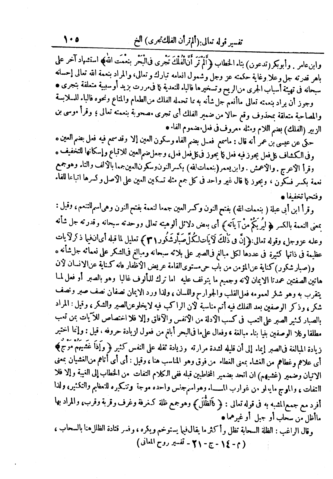 وقرأ إبن أبي عبلة بنعمات الله بفتح النون وكسر العين جمعا لنعمة بفتح النون وهي أسم للتنعم وقيل : بمعنى النعمة بالكسر ليريكم من آياته أي بعض دلائل ألوهيته تعالى ووحدته سبحانه وقدرته جل شأنه وعلمه عزوجل وقوله تعالى : إن في ذلك لآيات لكل صبار شكور 13 تعليل لما قبله أي إن فيما ذكر لآيات عظيمة في ذاتها كثيرة في عددها لكل مبالغ في الصبر على بلائه سبحانه ومبالغ في الشكر على نعمائه جل شأنه