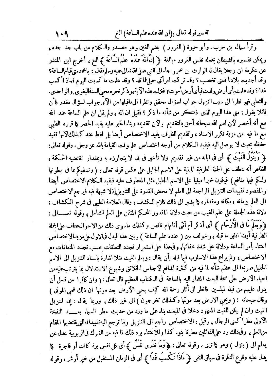 وقرأ سمال بن حرب وأبو حيوة الغرور بضم الغين وهو مصدر والكلام من باب جد جده ويمكن تفسيره بالشيطان بجعله نفس الغرور مبالغة إن الله عنده علم الساعة إلخ أخرج إبن المنذر عن عكرمة أن رجلا يقال له الوارث بن عمرو جاء إلى النبي صلى الله تعالى عليه وسلم فقال : يامحمد متى قيام الساعة وقد أجدبت بلادنا فمتى تخصب وقد تركت أمرأتي حبلى فما تلد وقد علمت ما كسبت اليوم فماذا أكسب غدا وقد علمت بأي أرض ولدت فبأي أرض أموت فنزلت هذه الآية وذكر نحوه محيي السنة البغوي والواحدي والثعلبي فهو نظرا إلى سبب النزول جواب لسؤال محقق ونظرا إلى ما قبلها من الآي جواب لسؤال مقدر كأن قائلا يقول : متى هذا اليوم الذي ذكر من شأنه ما ذكر فقيل إن الله ولم يقل أن علم الساعة عند الله مع أنه أخصر لأن أسم الله سبحانه أحق بالتقديم ولأن تقديمه وبناء الخبر عليه يفيد الحصر كما قرره الطيبي مع ما فيه من مزية تكرر الإسناد وتقديم الظرف يفيد الإختصاص أيضا بل لفظ عند كذلك تفيد حفظه بحيث لا يوصل إليه فيفيد الكلام من أوجه إختصاص علم وقت القيامة بالله عزوجل وقوله تعالى : وينزل الغيث أي في إبانه من غير تقديم ولا تأخير في بلد لا يتجاوزه به وبمقدار تقتضيه الحكمة الظاهر أنه عطف على الجملة الظرفية المبنية على الأسم الجليل على عكس قوله تعالى : ونسقيكم مما في بطونها ولكم فيها منافع فيكون خبرا مبنيا على الأسم الجليل مثل المعطوف عليه فيفيد الكلام الإختصاص أيضا والمقصود تقييدات التنزيل الراجعة إلى العلم لا محض القدرة على التنزيل إذ لا شبهة فيه فيرجع الإختصاص إلى العلم بزمانه ومكانه ومقداره كما يشير إلى ذلك كلام الكشسف وقال العلامة الطيبي في شرح الكشاف : دلالة هذه الجملة على علم الغيب من حيث دلالة المقدور المحكم المتقن على العلم الشامل وقوله تعالى ويعلم ما في الأرحام أي أذكر أم أنثى أتام أم ناقص وكذلك ما سوى ذلك من الأحوال عطف على الجملة الظرفية أيضا نظير ما قبله وخولف بين عنده علم الساعة وبين هذا ليدل في الأول على مزيد الإختصاص إعتناء بأمر الساعة ودلالة عل ىشدة خفائها وفي هذا على إستمرار تجدد التعلقات بحسب تجدد المتعلقات مع الإختصاص ولم يراع هذا الأسلوب فيما قبله بأن يقال : ويعلم الغيث مثلا إشارة بإسناد التنزيل إلى الأسم الجليل صريحا إلى عظم شأنه لما فيه من كثرة المنافع لأجناس الخلائق وشيوع الإستدلال بما يترتب عليه من أحياء الأرض على صحة البعث المشار إليه بالساعة في الكتاب العظيم قال تعالى : وإن كانوا من قبل أن ينزل عليهم من قبله لمبلسين فأنظر إلى آثار رحمة الله كيف يحيى الأرض بعد موتها إن ذلك لمحيي الموتى وقال سبحانه : ويحيى الأرض بعد موتها وكذلك تخرجون إلى غير ذلك وربما يقال : إن لتنزيل الغيث وإن لم يكن الغيث المعهود دخلا في المبعث بناء على ما ورد من حديث مطر السماء بعد النفخة الأولى مطرا كمني الرجال وقيل : الإختصاص راجع إلى التنزيل وما ترجع إليه تقييداته التي يقتضيها المقام من العلم وفي ذلك رد على القائلين مطرنا بنوء كذا وللإعتناء برد ذلك لما فيه من الشرك في الربوبية عدل عن يعلم إلى ينزل وهو كما ترى وقوله تعالى : وما تدري نفس أي كل نفس برة كانت أو فاجرة كما يدل عليه وقوع النكرة في سياق النفي ماذا تكسب غدا أي في الزمان المستقبل من خير أو شر وقوله