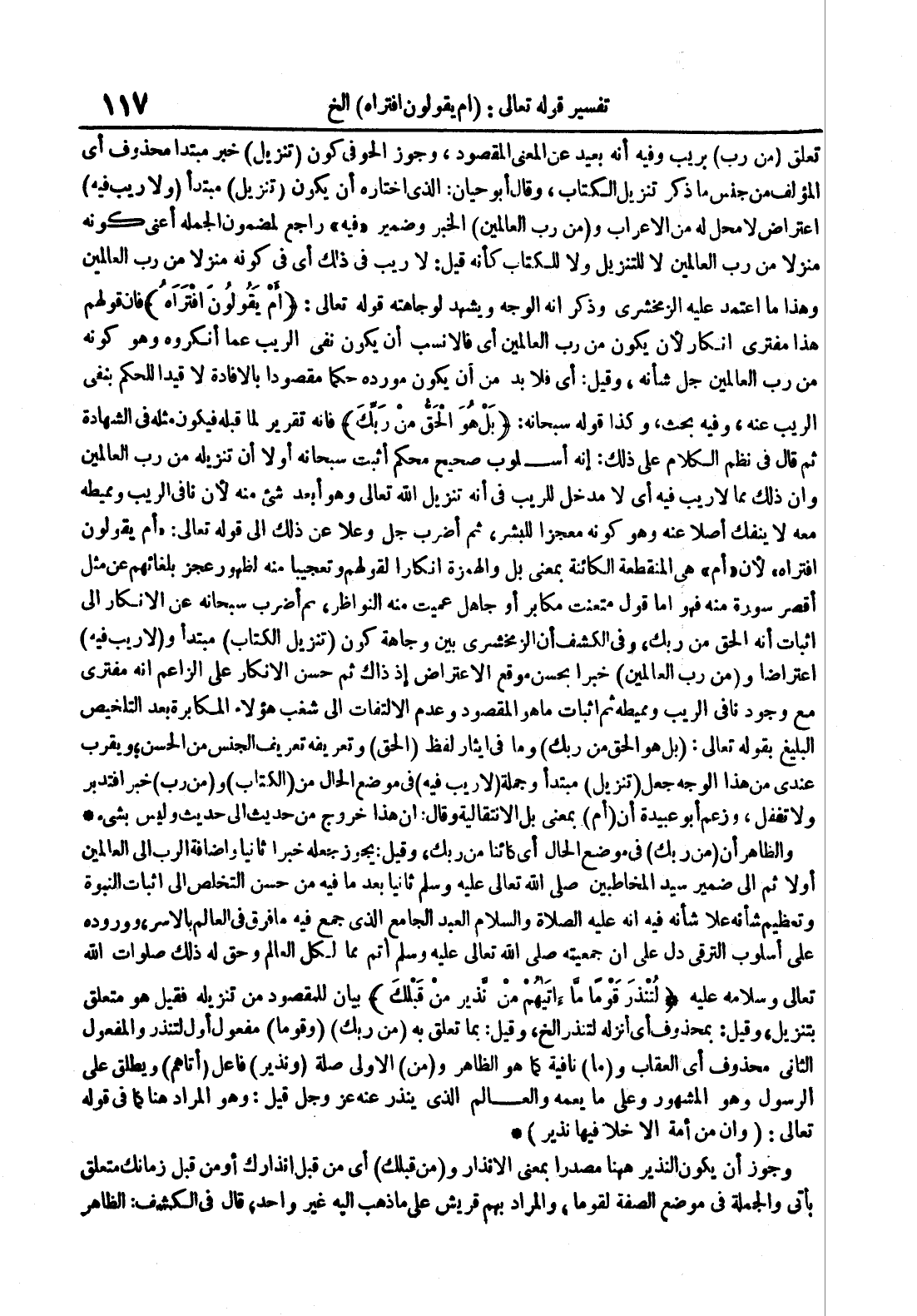 تعلق من رب بريب وفيه أنه بعيد عن المعنى المقصود وجوز الحوفي كون تنزيل خبر مبتدأ محذوف أي المؤلف من جنس ما ذكر تنزيل الكتاب وقال أبو حيان : الذي أختاره أن يكون تنزيل مبتدأ ولا ريب فيه إعتراض لا محل له من الإعراب و من رب العالمين الخبر وضمير فيه راجع لمضمون الجملة أعني كونه منزلا من رب العالمين لا للتنزيل ولا للكتاب كأنه قيل : لا ريب في ذلك أي في كونه منزلا من رب العالمين وهذا ما أعتمد عليه الزمخشري وذكر أنه الوجه ويشهد لوجاهته قوله تعالى : أم يقولون إفتراه فإن قولهم هذا مفترى إنكار لأن يكون من رب العالمين أي فالأنسب أن يكون نفي الريب عما أنكروه وهو كونه من رب العالمين جل شأنه وقيل : أي فلا بد من أن يكون مورده حكما مقصودا بالإفادة لا قيد للحكم بنفي الريب عنه وفيه بحث وكذا قوله سبحانه : بل هو الحق من ربك فإنه تقرير لما قبله فيكون مثله في الشهادة ثم قال في نظم الكلام على ذلك : إنه أسلوب صحيح محكم أثبت سبحانه أولا أن تنزيله من رب العالمين وإن ذلك مما لا ريب فيه أي لا مدخل للريب في أنه تنزيل الله تعالى وهو أبعد شيء منه لأن نافي الريب ومميطه معه لا ينفك أصلا عنه وهو كونه معجزا للبشر ثم أضرب جل وعلا عن ذلك إلى قوله تعالى : أم يقولون إفتراه لأن أم هي المنقطعة الكائنة بمعنى بل والهمزة إنكارا لقولهم وتعجيبا منه لظهور عجز بلغائهم عن مثل أقصر سورة منه فهو إما قول متعنت مكابر أو جاهل عميت منه النواظر ثم أضرب سبحانه عن الإنكار إلى إثبات أنه الحق من ربك وفي الكشف أن الزمخشري بين وجاهة كون تنزيل الكتاب مبتدأ و لا ريب فيه إعتراضا و من رب العالمين خبرا بحسن موقع الإعتراض إذ ذاك ثم حسن الإنكار على الزاعم أنه مفترى مع وجود نافي الريب ومميطه ثم إثبات ما هو المقصود وعدم الإلتفات إلى شغب هؤلاء المكابرة بعد التلخيص البليغ بقوله تعالى : بل هو الحق من ربك وما في إيثار لفظ الحق وتعريفه تعريف الجنس من الحسن ويقرب عندي من هذا الوجه جعل تنزيل مبتدأ وجملة لا ريب فيه في موضع الحال من الكتاب و من رب خبر فتدبر ولا تغفل وزعم أبو عبيدة أن أم بمعنى بل الإنتقالية وقال : إن هذا خروج من حديث إلى حديث وليس بشيء