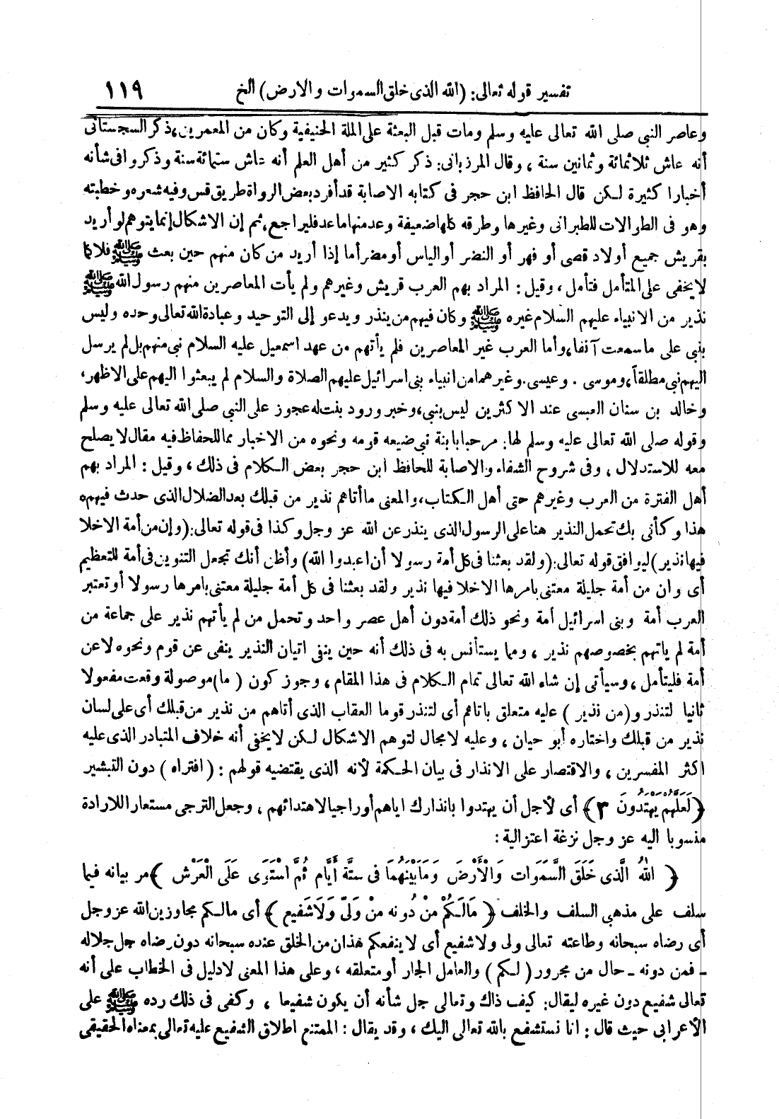 هذا وكأني بك تحمل النذير هنا على الرسول الذي ينذر عن الله عزوجل وكذا في قوله تعالى : وإن من أمة إلا خلا فيها نذير ليوافق قوله تعالى : ولقد بعثنا في كل أمة رسولا أن أعبدوا الله وأظن أنك تجعل التنوين في أمة للتعظيم أي وأن من أمة جليلة معتني بأمرها الإخلاء فيها نذير ولقد بعثنا في كل أمة جليلة معتني بأمرها رسولا أو تعتبر العرب أمة وبني إسرائيل أمة ونحو ذلك أمة دون أهل عصر واحد وتحمل من لم يأتهم نذير على جماعة من أمة لم يأتهم بخصوصهم نذير ومما يستأنس به في ذلك أنه حين ينفي إتيان النذير ينفي عن قوم ونحوه لا عن أمة فليتأمل وسيأتي إن شاء الله تعالى تمام الكلام في هذا المقام وجوز كون ما موصولة وقعت مفعولا ثانيا لتنذر و من نذير عليه متعلق بأتاهم أي لتنذر قوما العقاب الذي أتاهم من نذير من قبلك أي على لسان نذير من قبلك وأختاره أبو حيان وعليه لا مجال لتوهم الإشكال لكن لا يخفى أنه خلاف المتبادر الذي عليه أكثر المفسرين والإقتصار على الإنذار في بيان الحكمة لأنه الذي يقتضيه قولهم : إفتراه دون التبشير لعلهم يهتدون 3 أي لأجل أن يهتدوا بإنذارك إياهم أو راجيا لإهتدائهم وجعل الترجي مستعارا للإرادة منسوبا إليه عزوجل نزغة إعتزالية : الله الذي خلق السموات والأرض وما بينهما في ستة أيام ثم أستوى على العرش مر بيانه فيما سلف على مذهبي السلف والخلف ما لكم من دونه من ولي ولا شفيع أي ما لكم مجاوزين الله عزوجل أي رضاه سبحانه وطاعته تعالى ولي ولا شفيع أي لا ينفعكم هذان من الخلق عنده سبحانه دون رضاه جل جلاله فمن دونه حال من مجرور لكم والعامل الجار أو متعلقه وعلى هذا المعنى لا دليل في الخطاب على أنه تعالى شفيع دون غيره ليقال : كيف ذاك وتعالى جل شأنه أن يكون شفيعا وكفى في ذلك رده على الأعرابي حيث قال : أنا نستشفع بالله تعالى إليك وقد يقال : الممتنع إطلاق الشفيع عليه تعالى بمعناه الحقيقي