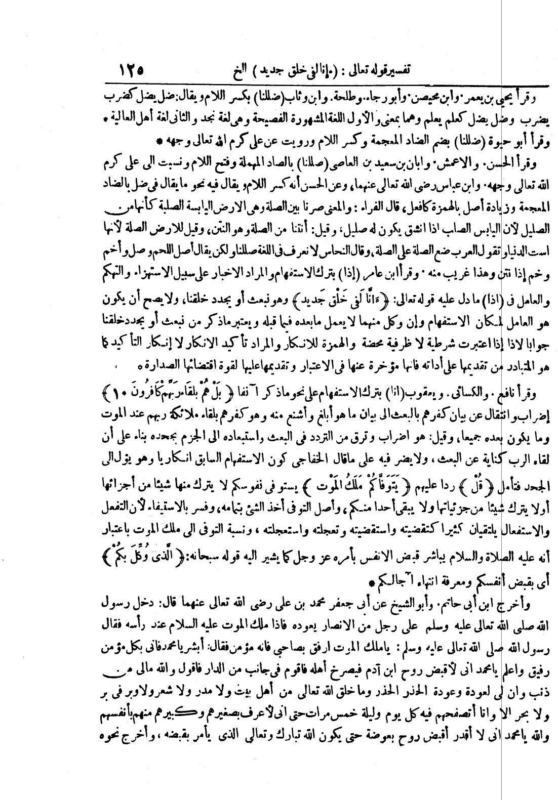 وقرأ نافع والكسائي ويعقوب أنا بترك الإستفهام على نحو ما ذكر آنفا بل هم بلقاء ربهم كافرون 01 إضراب وإنتقال عن بيان كفرهم بالبعث إلى بيان ما هو أبلغ وأشنع منه وهو كفرهم بلقاء ملائكة ربهم عند الموت وما يكون بعده جميعا وقيل : هو إضراب وترق من التردد في البعث وإستبعاده إلى الجزم بجحده بناء على أن لقاء الرب كناية عن البعث ولا يضر فيه على ما قال الخفاجي كون الإستفهام السابق إنكاريا وهو يؤل إلى الجحد فتأمل قل ردا عليهم يتوفاكم ملك الموت يستوفي نفوسكم لا يترك منها شيئا من أجزائها أولا يترك شيئا من جزئياتها ولا يبقى أحدا منكم وأصل التوفي أخذ الشيء بتمامه وفسر بالإستيفاء لأن التفعل والإستفعال يلتقيان كثيرا كتقضيته وأستقضيته وتعجلته وأستعجلته ونسبة التوفي إلى ملك الموت بإعتبار أنه عليه الصلاة و السلام يباشر قبض الأنفس بأمره عزوجل كما يشير إليه قوله سبحانه : الذي وكل بكم أي يقبض أنفسكم ومعرفة إنتهاء آجالكم