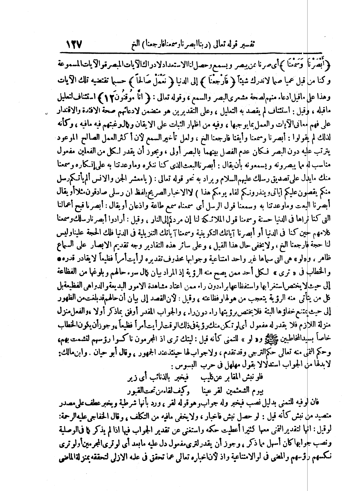 أبصرنا وسمعنا أي صرنا ممن يبصر ويسمع وحصل لنا الإستعداد لإدراك الآيات المبصرة والآيات المسموعة وكنا من قبل عميا صما لا ندرك شيئا فأرجعنا إلى الدنيا نعمل صالحا حسبما تقتضيه تلك الآيات وهذا على ما قيل إدعاء منهم لصحة مشعري البصر والسمع وقوله تعالى : إنا موقنون 21 إستئناف لتعليل ما قبله وقيل : إستئناف لم يقصد به التعليل وعلى التقديرين هو متضمن لأدعائهم صحة الأفئدة والإقتدار على فهم معاني الآيات والعمل بما يوجبها وفيه من إظهار الثبات على الإيقان وكمال رغبتهم فيه ما فيه وكأنه لذلك لم يقولوا : أبصرنا وسمعنا وأيقنا فأرجعنا إلخ ولعل تأخير السمع لأن أكثر العمل الصالح الموعود يترتب عليه دون البصر فكان عدم الفصل بينهما بالبصر أولى ويجوز أن يقدر لكل من الفعلين مفعول مناسب له مما يبصرونه ويسمعونه بأن يقال : أبصرنا بالبعث الذي كنا ننكره وما وعدتنا به على إنكاره وسمعنا منك ما يدل على تصديق رسلك عليهم السلام ويراد به نحو قوله تعالى : يا معشر الجن والإنس ألم يأتكم رسل منكم يقصون عليكم آياتي وينذرونكم لقاء يومكم هذا لا الأخبار الصريح بلفظ أن رسلي صادقون مثلا أو يقال أبصرنا البعث وسمعنا قول الرسل أي سمعناه سمع طاعة وإذعان أو يقال : أبصرنا قبح أعمالنا التي كنا نراها في الدنيا حسنة وسمعنا قول الملائكة لنا إن مردكم إلى النار وقيل : أرادوا أبصرنا رسلك وسمعنا كلامهم حين كنا في الدنيا أو أبصرنا آياتك التكوينية وسمعنا آياتك التنزيلية في الدنيا فلك الحجة علينا وليس لنا حجة فأرجعنا إلخ ولا يخفى حال هذا القيل وعلى سائر هذه التقادير وجه تقديم الإبصار على السماع ظاهر و لو هي التي سماها غير واحد إمتناعية وجوابها محذوف تقديره لرأيت أمرا فظيعا لا يقادر قدره