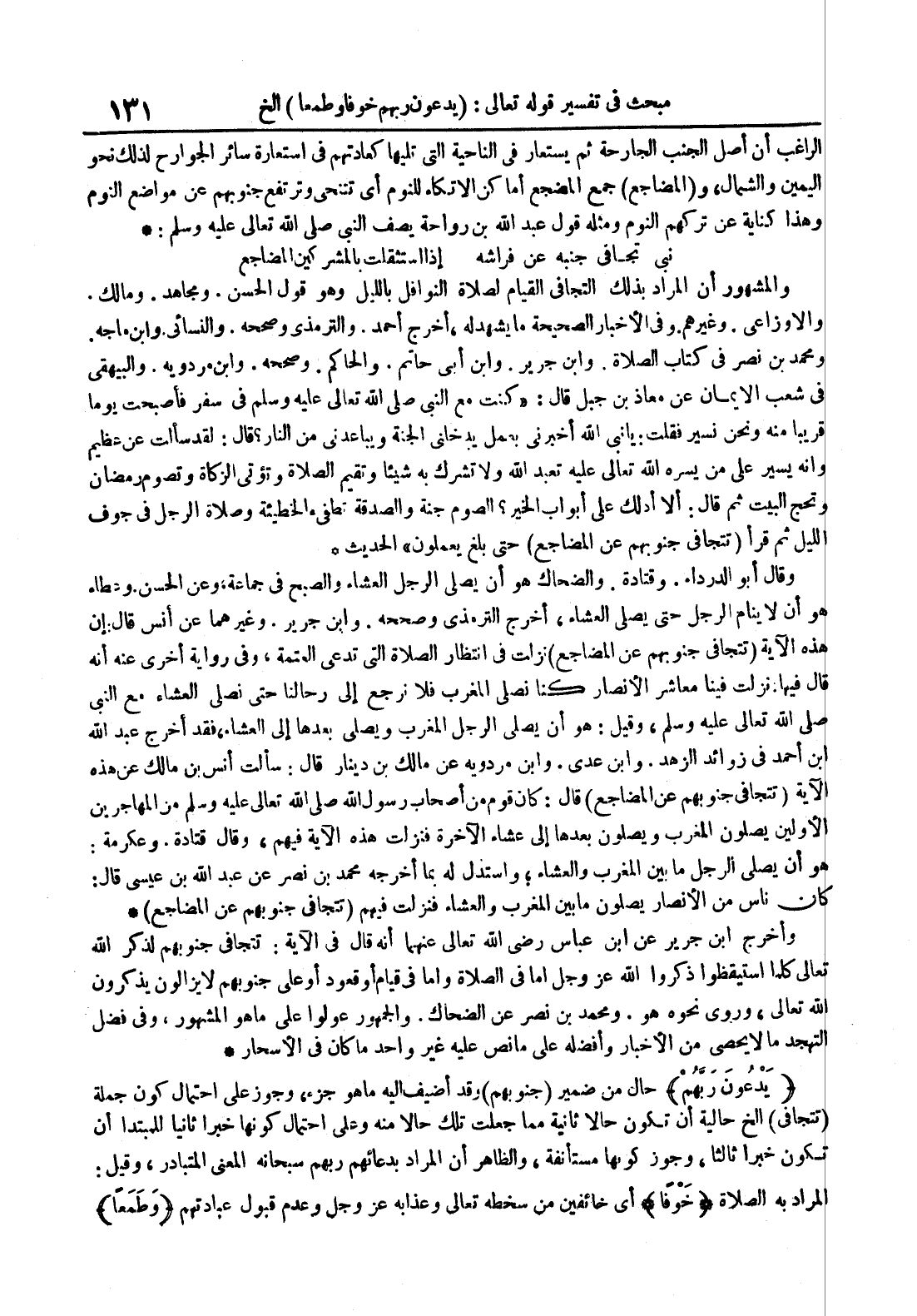 وقال أبو الدرداء وقتادة والضحاك هو أن يصلي الرجل العشاء والصبح في جماعة وعن الحسن وعطاء هو أن لا ينام الرجل حتى يصلي العشاء أخرج الترمذي وصححه وإبن جرير وغيرهما عن أنس قال : إن هذه الآية تتجافى جنوبهم عن المضاجع نزلت في إنتظار الصلاة التي تدعى العتمة وفي رواية أخرى عنه أنه قال فيها نزلت فينا معاشر الأنصار كنا نصلي المغرب فلا نرجع إلى رجالنا حتى نصلي العشاء مع النبي صلى الله تعالى عليه وسلم وقيل : هو أن يصلي الرجل المغرب ويصلي بعدها إلى العشاء فقد أخرج عبدالله إبن أحمد في زوائد الزهد وإبن عدي وإبن مردويه عن مالك بن دينار قال : سألت أنس بن مالك عن هذه الآية تتجافى جنوبهم عن المضاجع قال : كان قوم من أصحاب رسول الله صلى الله تعالى عليه وسلم من المهاجرين الأولين يصلون المغرب ويصلون بعدها إلى عشاء الآخرة فنزلت هذه الآية فيهم وقال قتادة وعكرمة : هو أن يصلي الرجل ما بين المغرب والعشاء وأستدل له بما أخرجه محمد بن نصر عن عبدالله بن عيسى قال : كان ناس من الأنصار يصلون ما بين المغرب والعشاء فنزلت فيهم تتجافى جنوبهم عن المضاجع